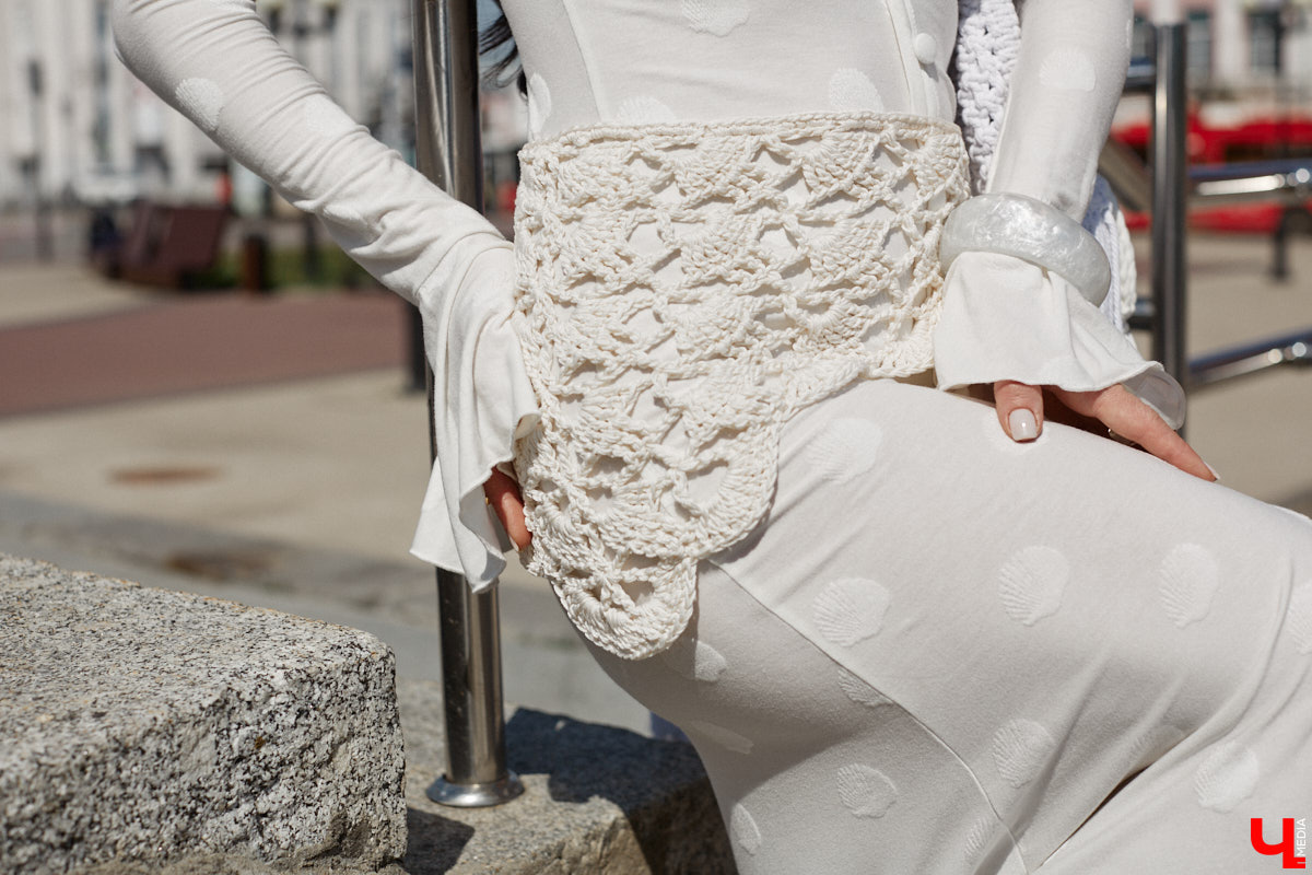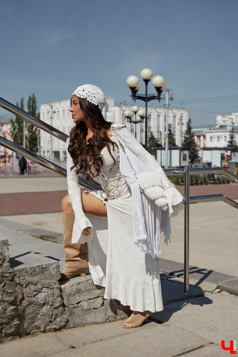 Второй белоснежный образ с трикотажным платьем от Embody получился универсальным. В таком не проблема выйти на прогулку днем, посетить светское мероприятие вечером, даже съездить на море. Сочетаю его с летними сапогами, вязаной сумкой и шапочкой из Raffi. Она должна быть у каждой модницы!» — считает наша героиня.