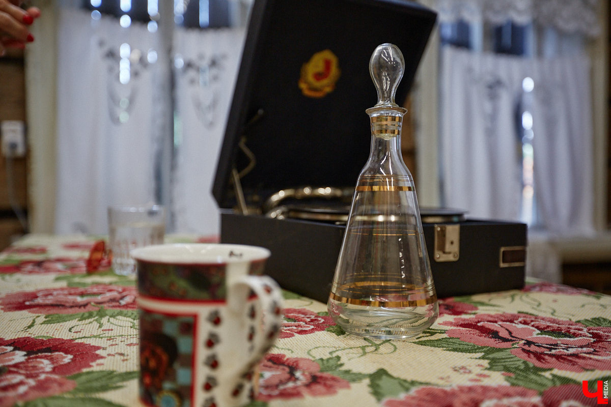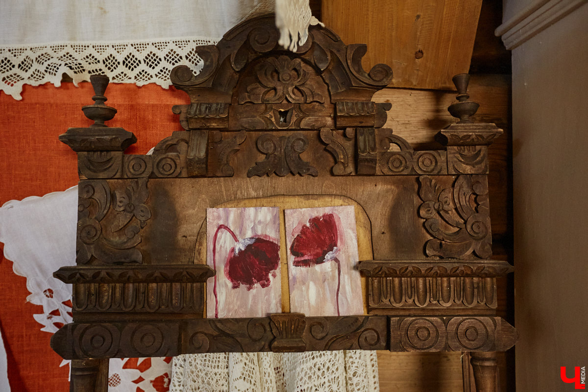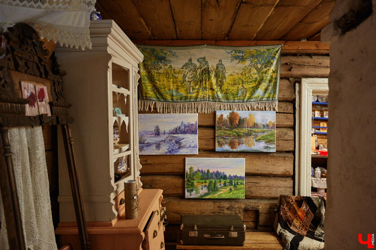 На стенах дома висят картины художника, который реставрировал фрески Рублева. Также среди экспонатов комод, ткацкий станок и патефон с набором пластинок. Услышать голос Лидии Руслановой в здании с двухсотлетней историей — совершенно особенный вид эстетического удовольствия! Сравнивать цифровые записи с потрескиванием пластинки даже не стоит. Атмосфера совсем другая.