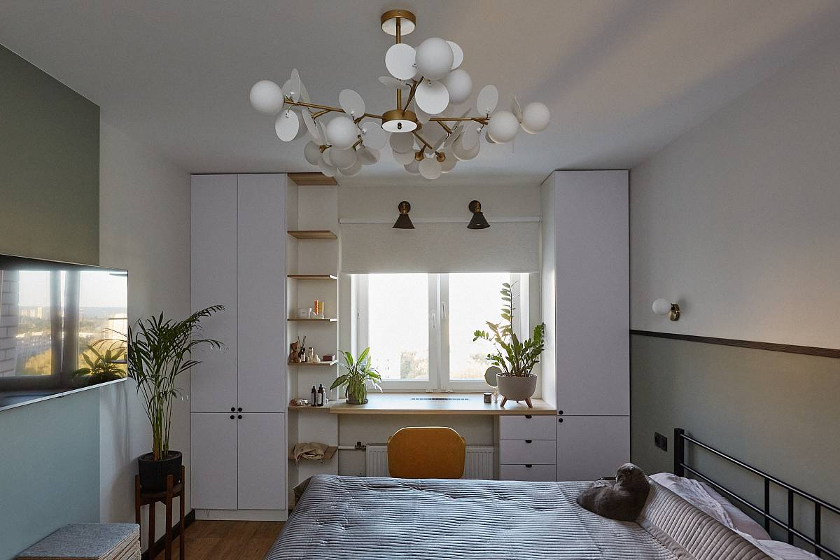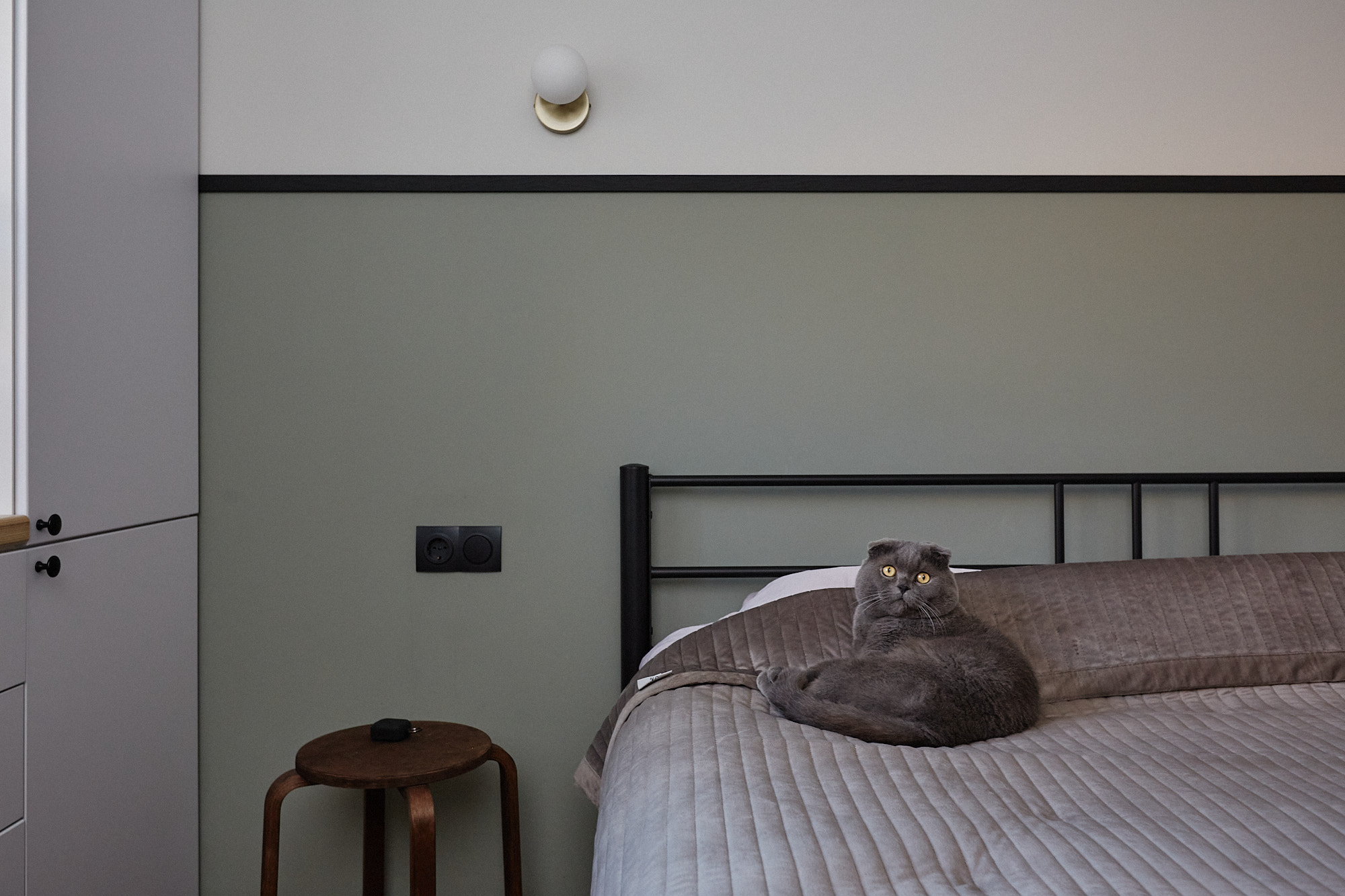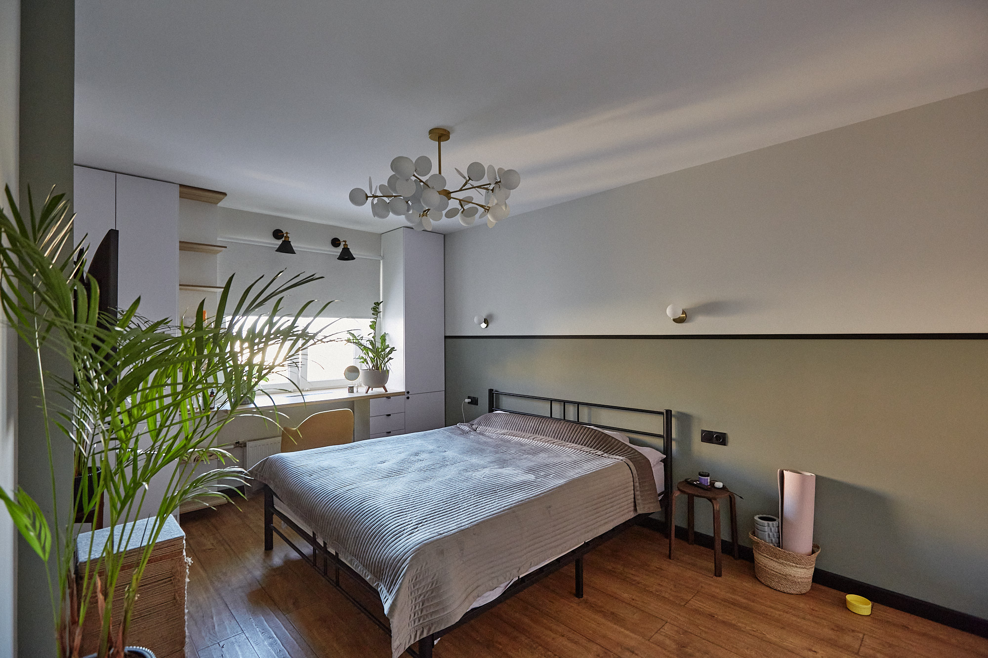 Спальня пары такая же немногословная, как и весь интерьер. Табуретки вместо тумбочек, домик и любимая когтеточка Джонни под телевизором, кровать кинг-сайз и вытащенные с того света пальмы – Никита привез их с рынка абсолютно желтыми. Гардероб, спрятанный в интегрированных шкафах, небольшой, особенно у главы семейства. К одежде ребята относятся трепетно: выбирают качественную и долговечную.