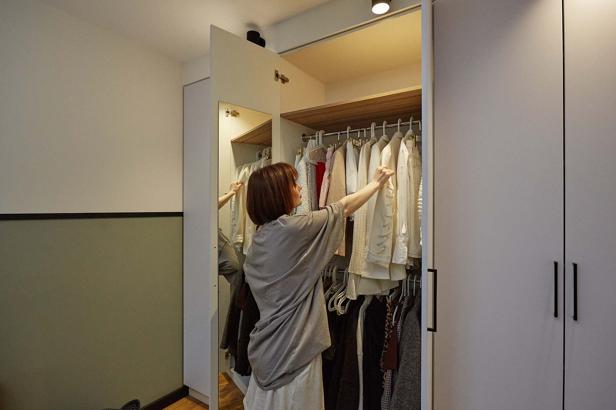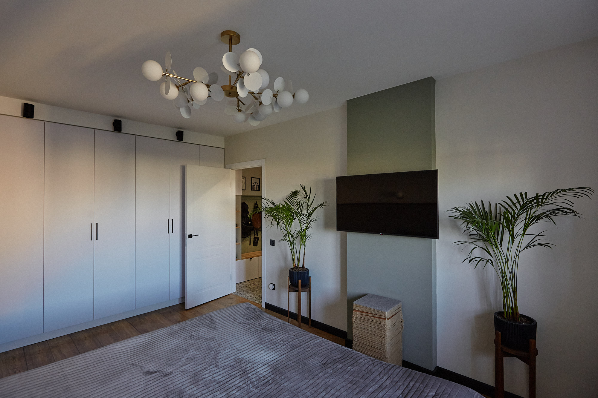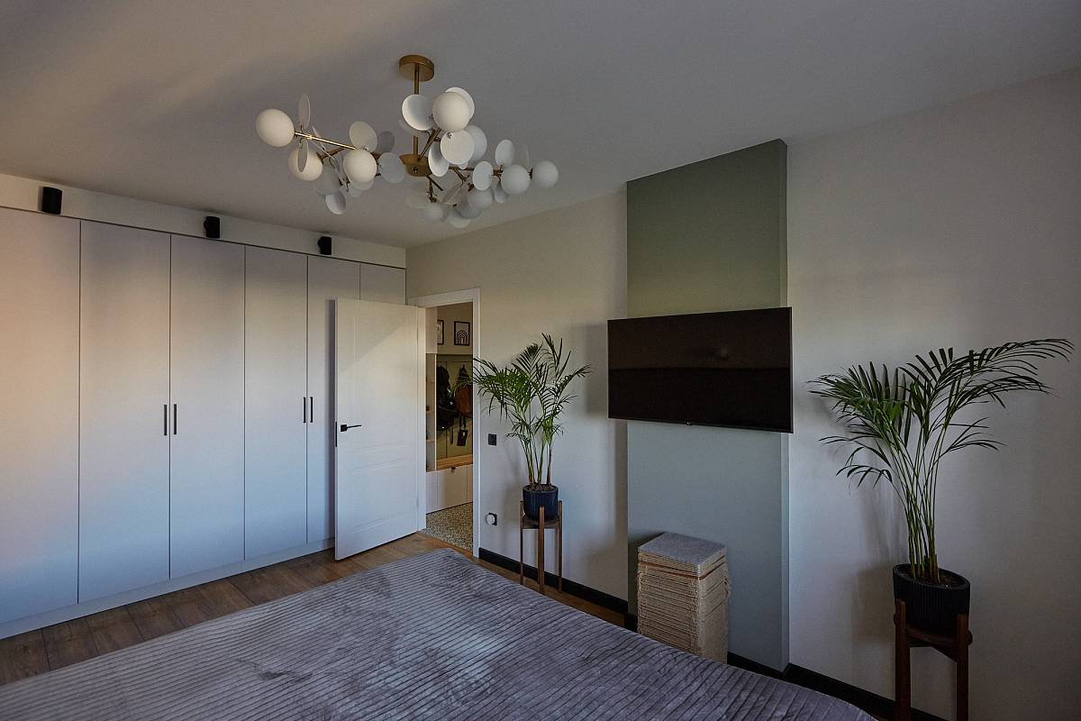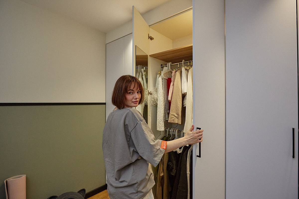Спальня пары такая же немногословная, как и весь интерьер. Табуретки вместо тумбочек, домик и любимая когтеточка Джонни под телевизором, кровать кинг-сайз и вытащенные с того света пальмы – Никита привез их с рынка абсолютно желтыми. Гардероб, спрятанный в интегрированных шкафах, небольшой, особенно у главы семейства. К одежде ребята относятся трепетно: выбирают качественную и долговечную.