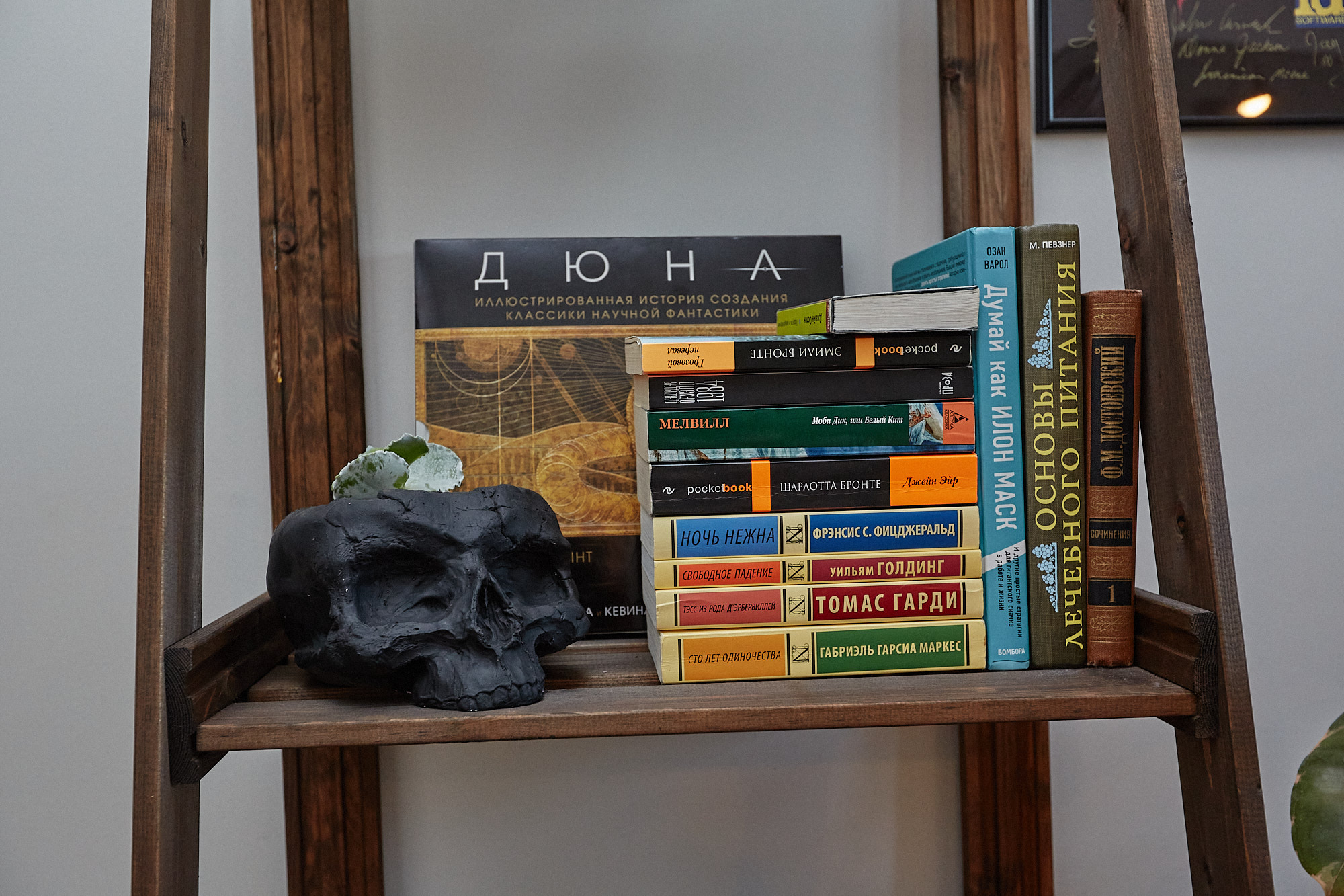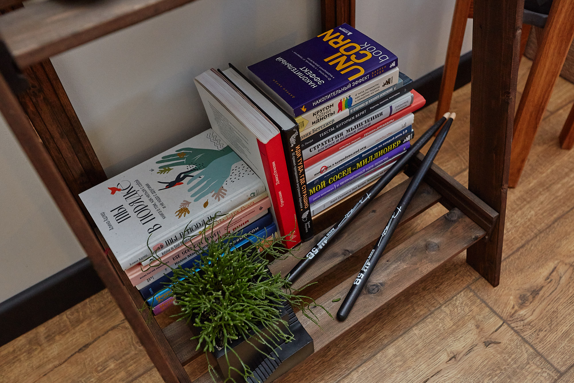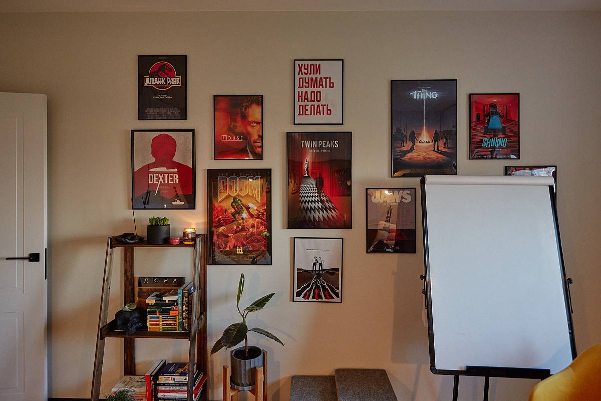 В удобных креслах можно расположиться с ноутбуком, на визуализацию работают постеры любимых фильмов, сериалов, игр. Тихая спокойная музыка и аромат свечей помогают расслабиться, с умом организованный свет позволяет трудиться в любое время суток.