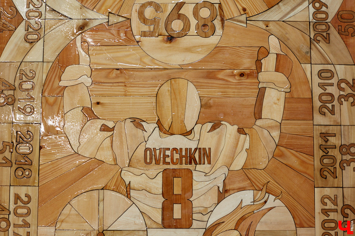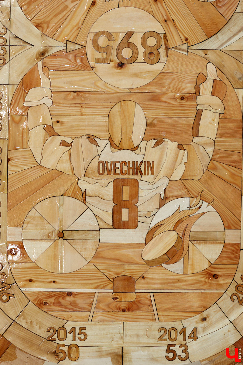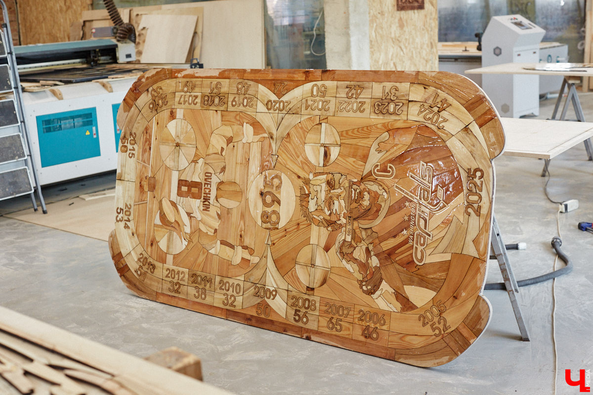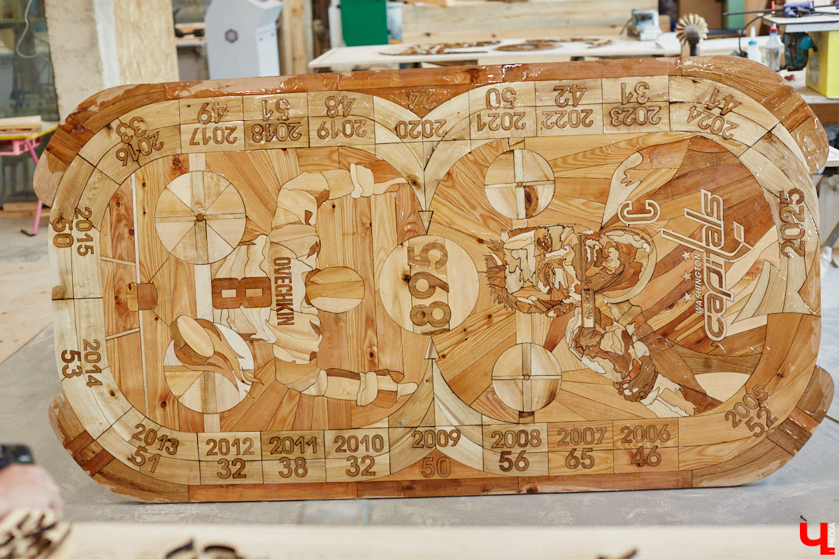 Всего на изготовление стола ушло около 500 отдельных деревянных деталей. Сначала мастера вырезали их на специальном станке, а затем выложили картину. На ней изображена стилизованная хоккейная площадка, в центре которой цифра рекорда, по бокам — годы, проведенные Овечкиным в НХЛ, и количество голов, забитых им в каждом сезоне. Есть даже проекция того самого щелчка клюшкой, который навсегда вписал имя Овечкина в историю спорта, и два фото хоккеиста: с номером на спине и с победной шайбой в зубах. Размер пазла 2,3 на 1,2 метра — хоккейная площадка в натуральную величину в масштабе примерно 1 к 26.