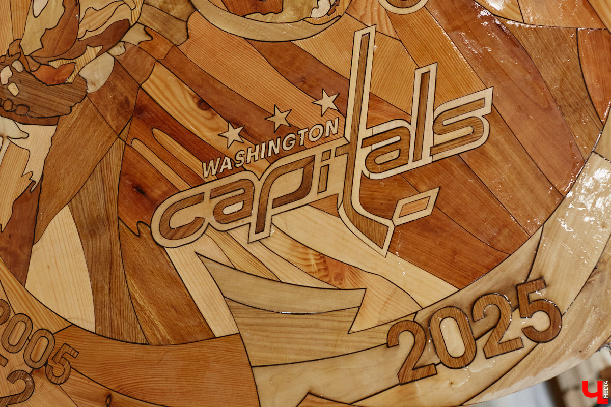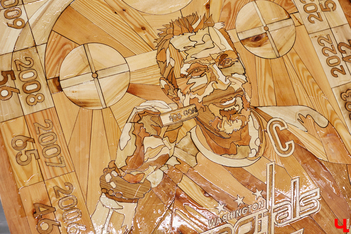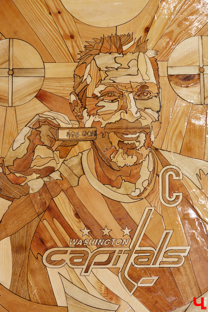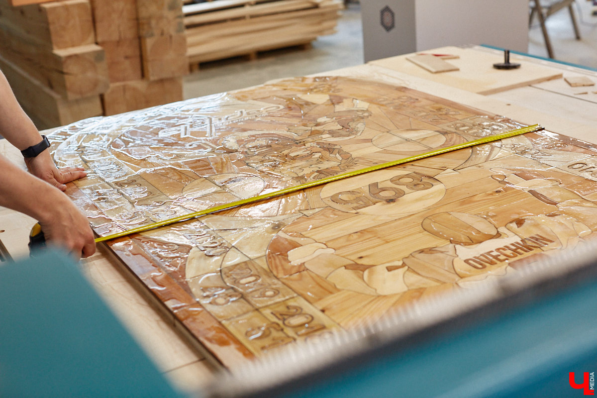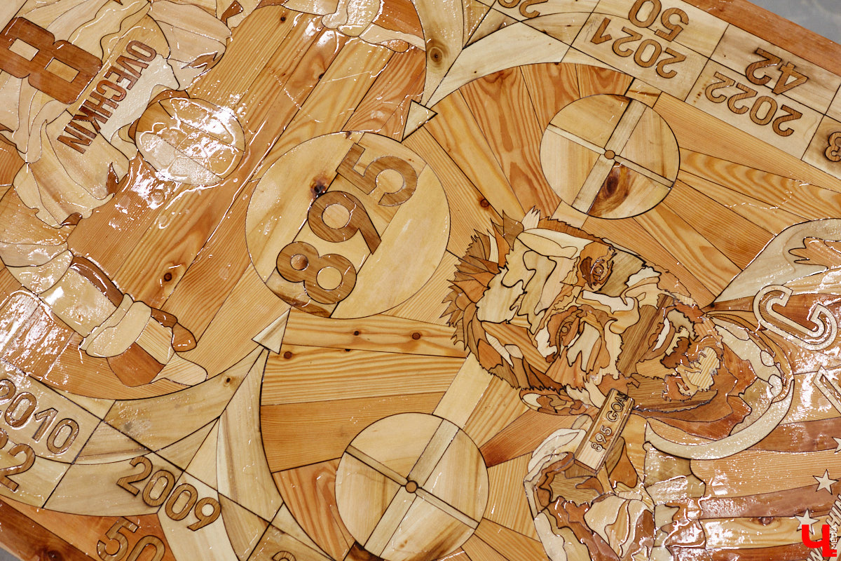 Всего на изготовление стола ушло около 500 отдельных деревянных деталей. Сначала мастера вырезали их на специальном станке, а затем выложили картину. На ней изображена стилизованная хоккейная площадка, в центре которой цифра рекорда, по бокам — годы, проведенные Овечкиным в НХЛ, и количество голов, забитых им в каждом сезоне. Есть даже проекция того самого щелчка клюшкой, который навсегда вписал имя Овечкина в историю спорта, и два фото хоккеиста: с номером на спине и с победной шайбой в зубах. Размер пазла 2,3 на 1,2 метра — хоккейная площадка в натуральную величину в масштабе примерно 1 к 26.