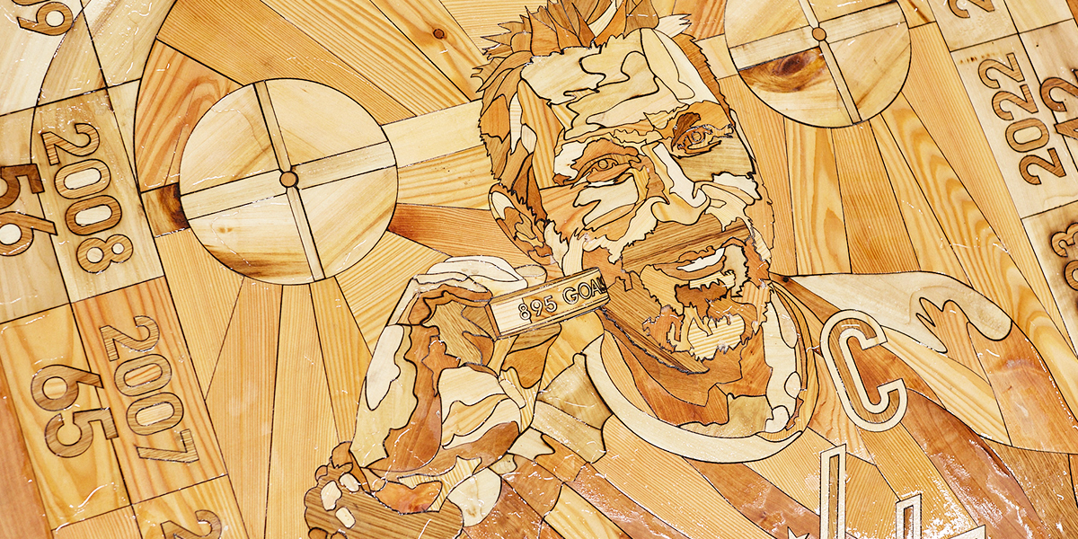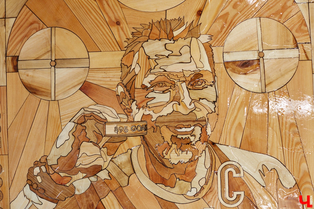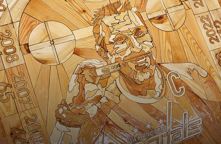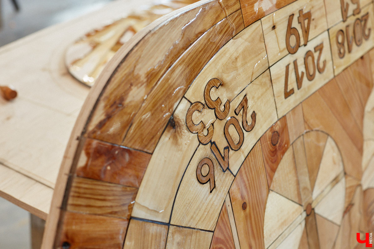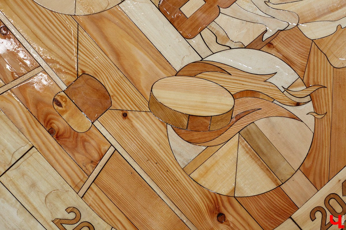 Всего на изготовление стола ушло около 500 отдельных деревянных деталей. Сначала мастера вырезали их на специальном станке, а затем выложили картину. На ней изображена стилизованная хоккейная площадка, в центре которой цифра рекорда, по бокам — годы, проведенные Овечкиным в НХЛ, и количество голов, забитых им в каждом сезоне. Есть даже проекция того самого щелчка клюшкой, который навсегда вписал имя Овечкина в историю спорта, и два фото хоккеиста: с номером на спине и с победной шайбой в зубах. Размер пазла 2,3 на 1,2 метра — хоккейная площадка в натуральную величину в масштабе примерно 1 к 26.