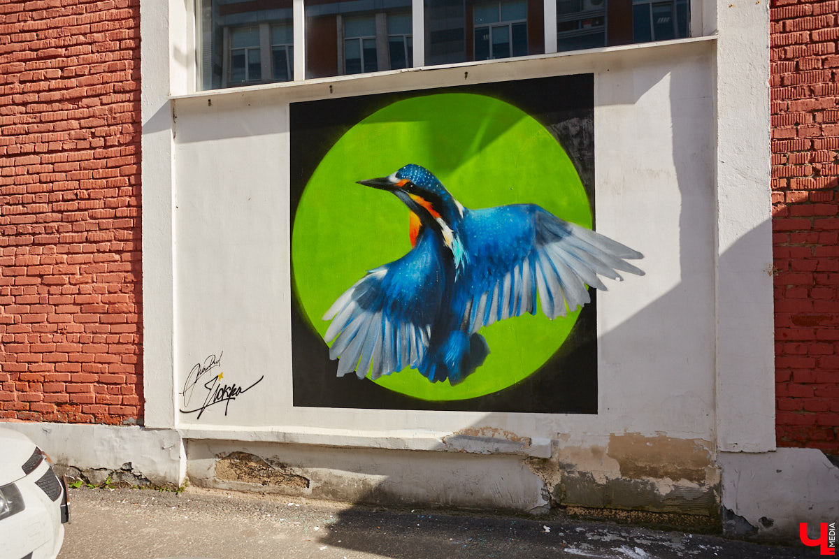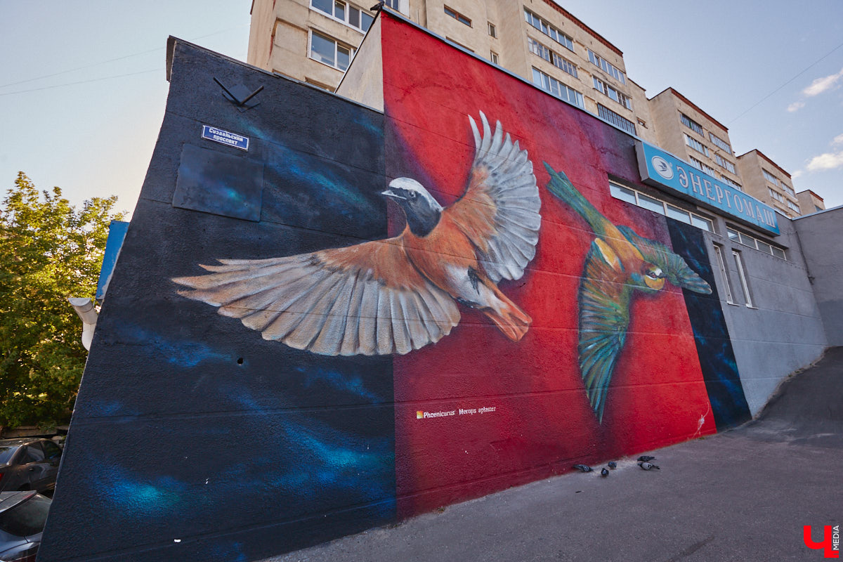 Художник из областной столицы подарил ей немало ярких произведений. Вероятно, самыми узнаваемыми для горожан стали птицы — не райские, а наши, хорошо знакомые. Зимородок ожил несколько лет назад на улице Дворянской, а горихвостка и золотистая щурка раскинули крылья на Суздальском проспекте.