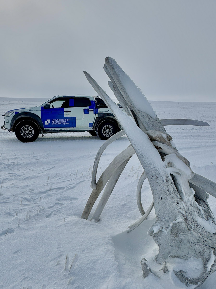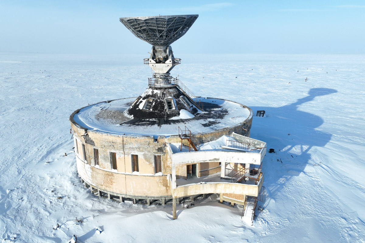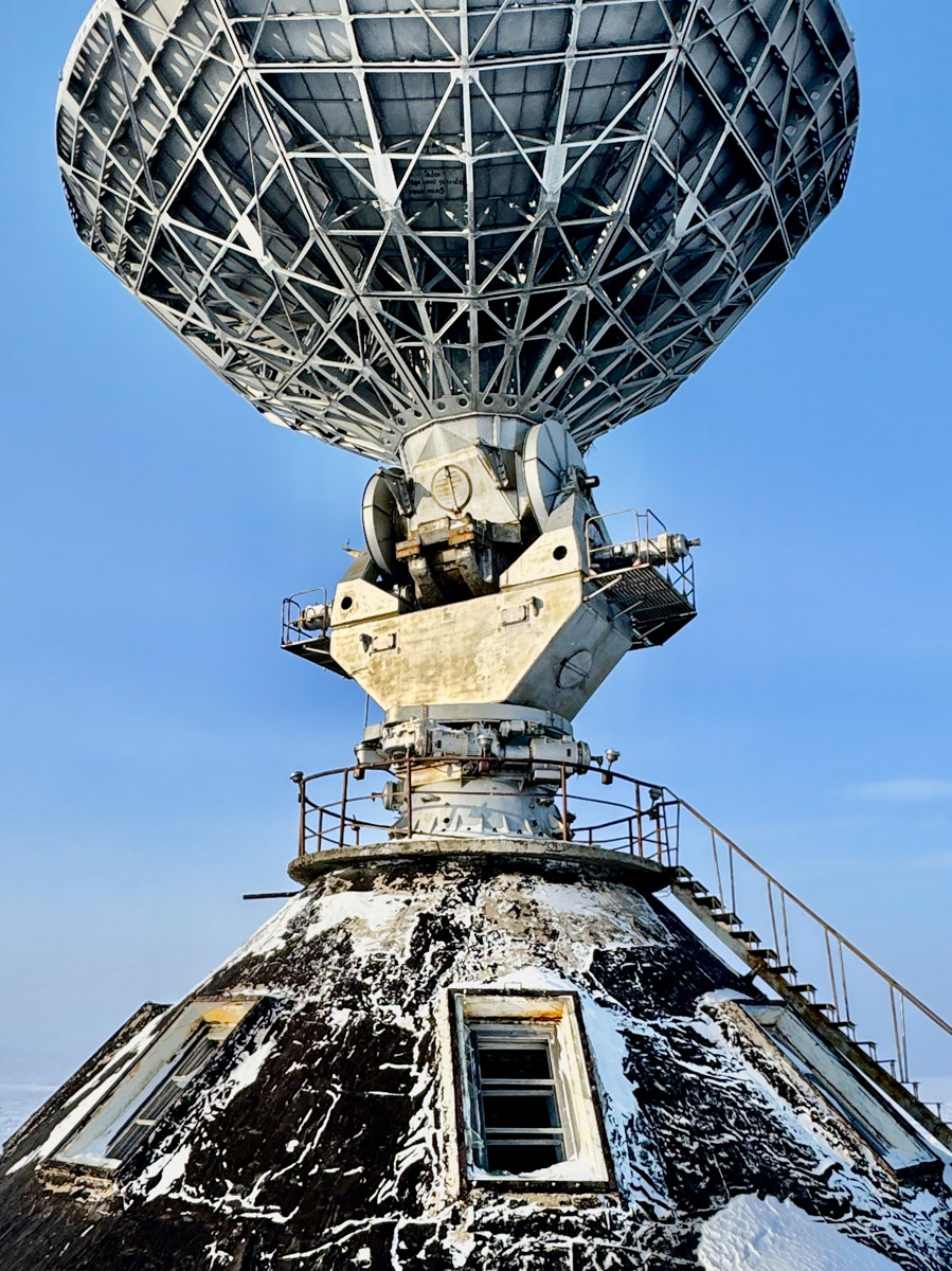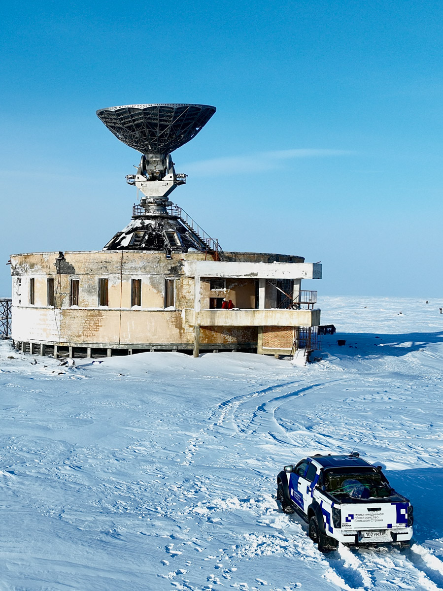 Легких путей Рустам действительно не ищет. К примеру, часть маршрута пролегала прямо по Северному Ледовитому океану. Но не будем забегать вперед. Пока наши герои только свернули с колымской трассы на автозимник «Арктика», тончайшей артерией проходящий по телу карты. По пути они насладились красотой Черского и Момского хребтов, а еще заехали в поселок Зырянка, где увидели интересный артефакт — станцию «Орбита».