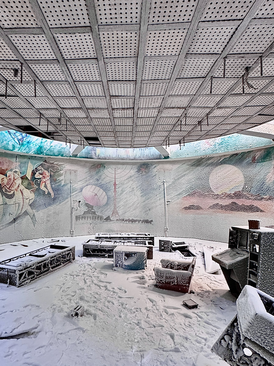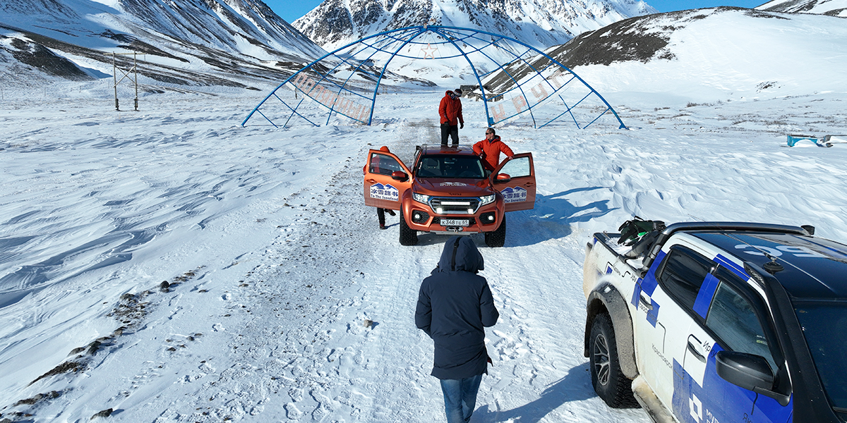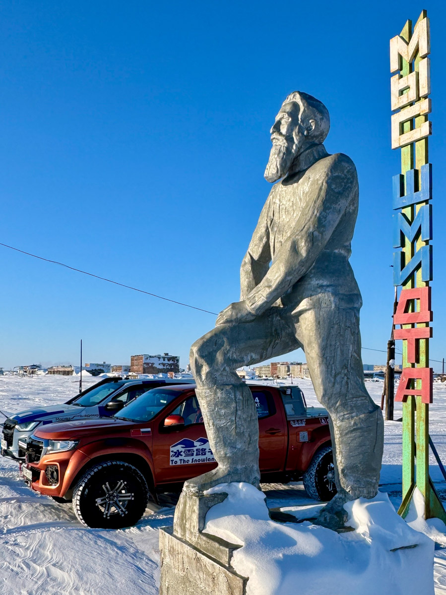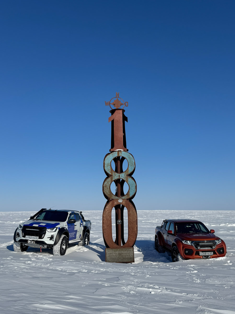 Легких путей Рустам действительно не ищет. К примеру, часть маршрута пролегала прямо по Северному Ледовитому океану. Но не будем забегать вперед. Пока наши герои только свернули с колымской трассы на автозимник «Арктика», тончайшей артерией проходящий по телу карты. По пути они насладились красотой Черского и Момского хребтов, а еще заехали в поселок Зырянка, где увидели интересный артефакт — станцию «Орбита».