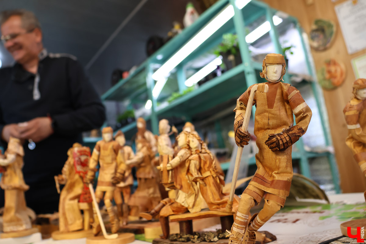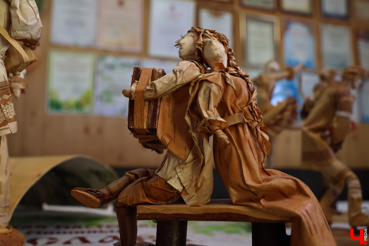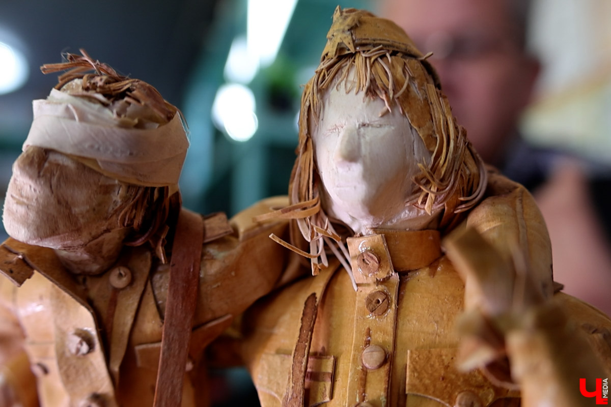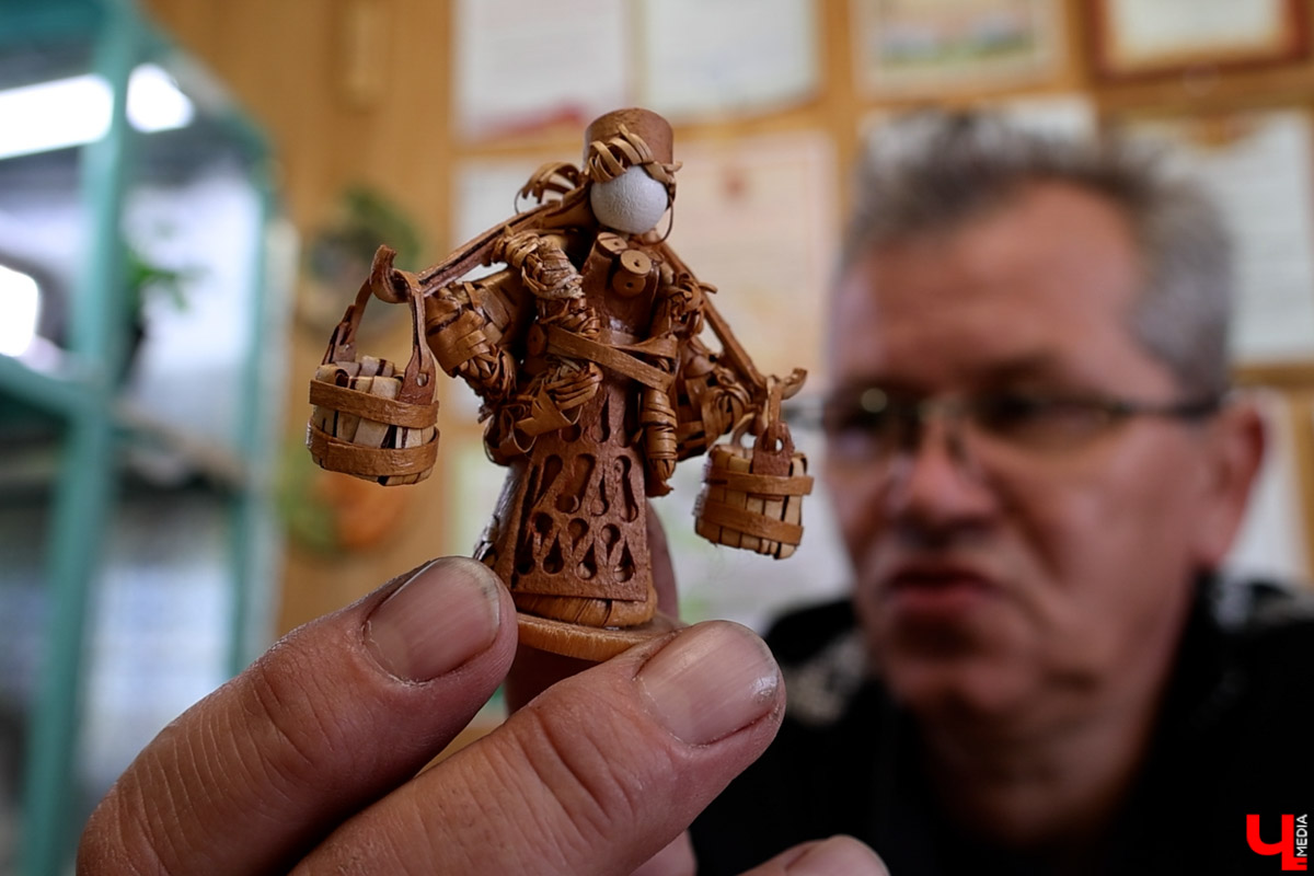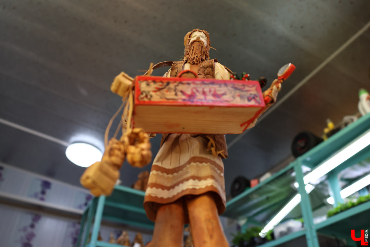 Вы видели когда-нибудь скульптурные композиции из бересты? Если нет, самое время заглянуть в гости к мастеру из Юрьев-Польского района Григорию Мишину. В этом году его работа вошла в число лучших сувениров Золотого кольца. Судьи отметили коробейника, выполненного из коры березы. Хотя на главный приз могла претендовать любая фигура: от хоккеистов до русской барышни с самоваром или балерины в пачке и на пуантах. Все куклы выполнены в единственном экземпляре и каждая настоящий шедевр.