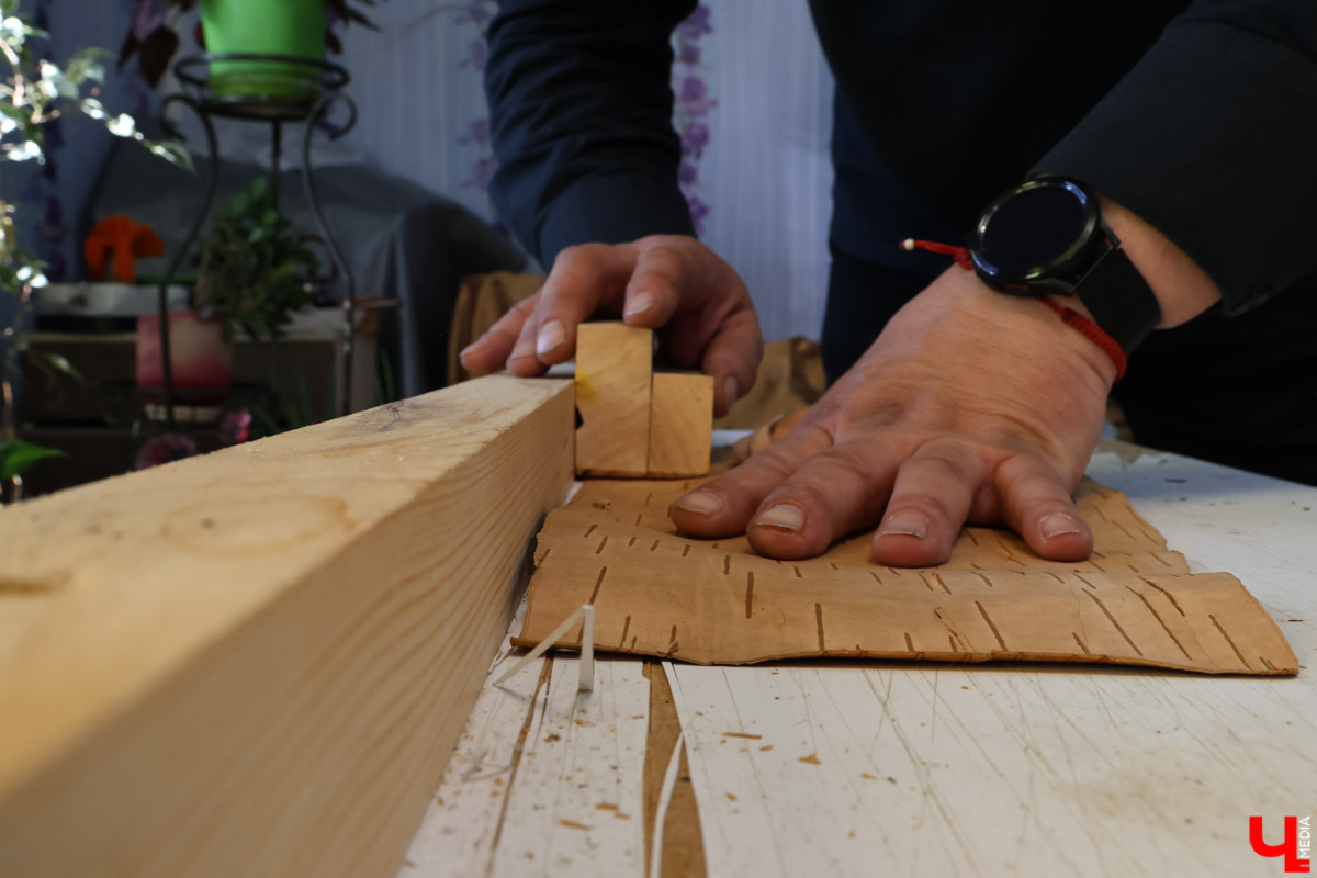 Бересту мужчина не красит. Оттенки подбирает естественным образом, чередуя различные кусочки коры. Найти хорошее дерево — задача не из простых. Летом на заготовки мастер ездит в Псковскую область. Берет ровно столько, чтобы хватило на сезон. Хранить материал сложно, он становится хрупким и начинает крошиться в руках.