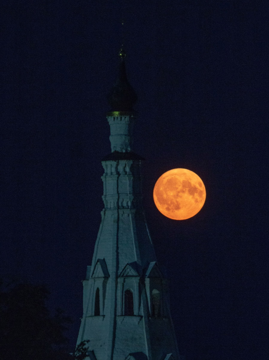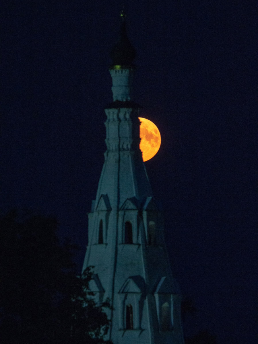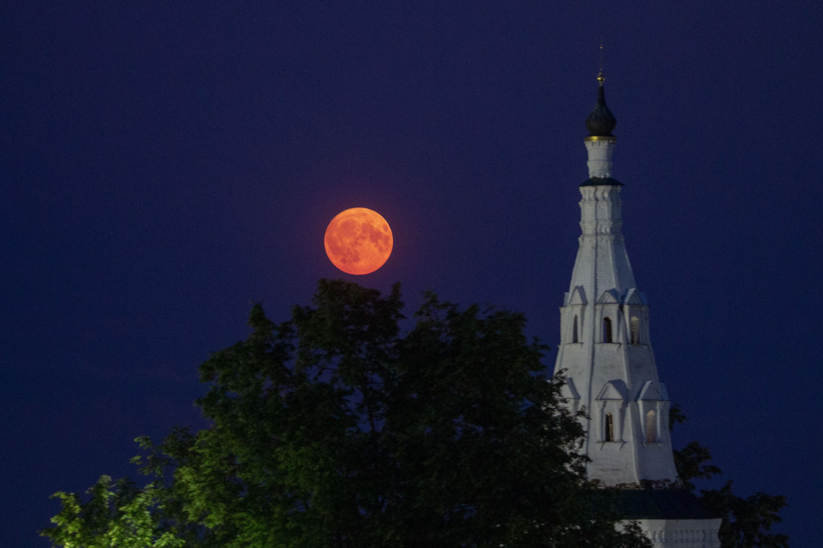 Еще одни редкие летние кадры опубликовал на своей странице в социальных сетях житель Суздаля, который изготавливает деревянные макеты соборов и храмов. Фото сделаны в селе Кидекша на телеобъектив. Алексей Осетров делится снимками клубничного полнолуния.