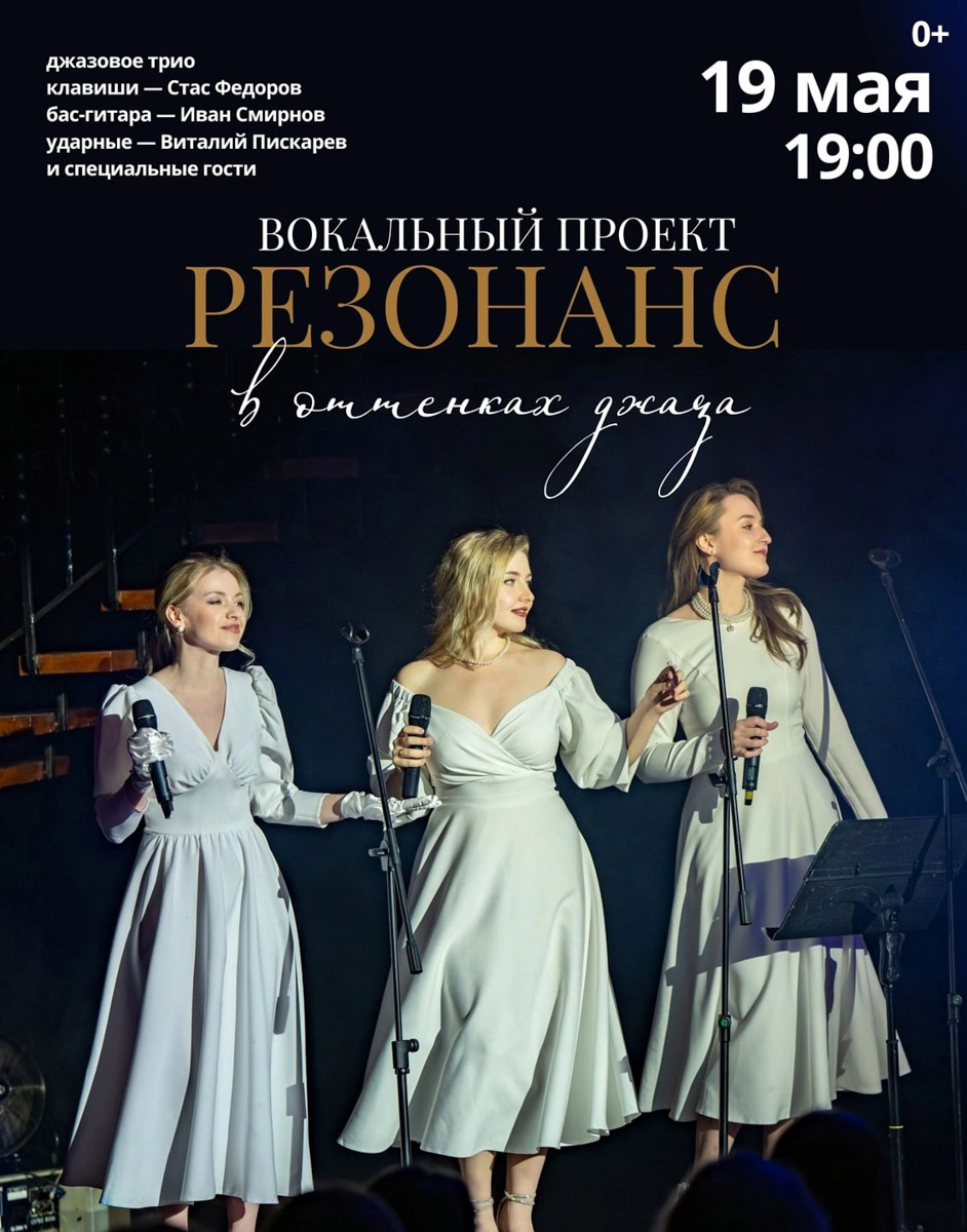 Вокальный проект «Резонанс» и талантливые владимирские музыканты приглашают погрузиться в неповторимую атмосферу джаза и многоголосия! Громкие хиты, ностальгические треки и любимые песни прозвучат в джазовых аранжировках: от советской музыки до легендарных мировых хитов. Женские голоса в сочетании с живым звуком подарят возможность почувствовать эстетику джазовой эпохи и получить истинное наслаждение от майского вечера.