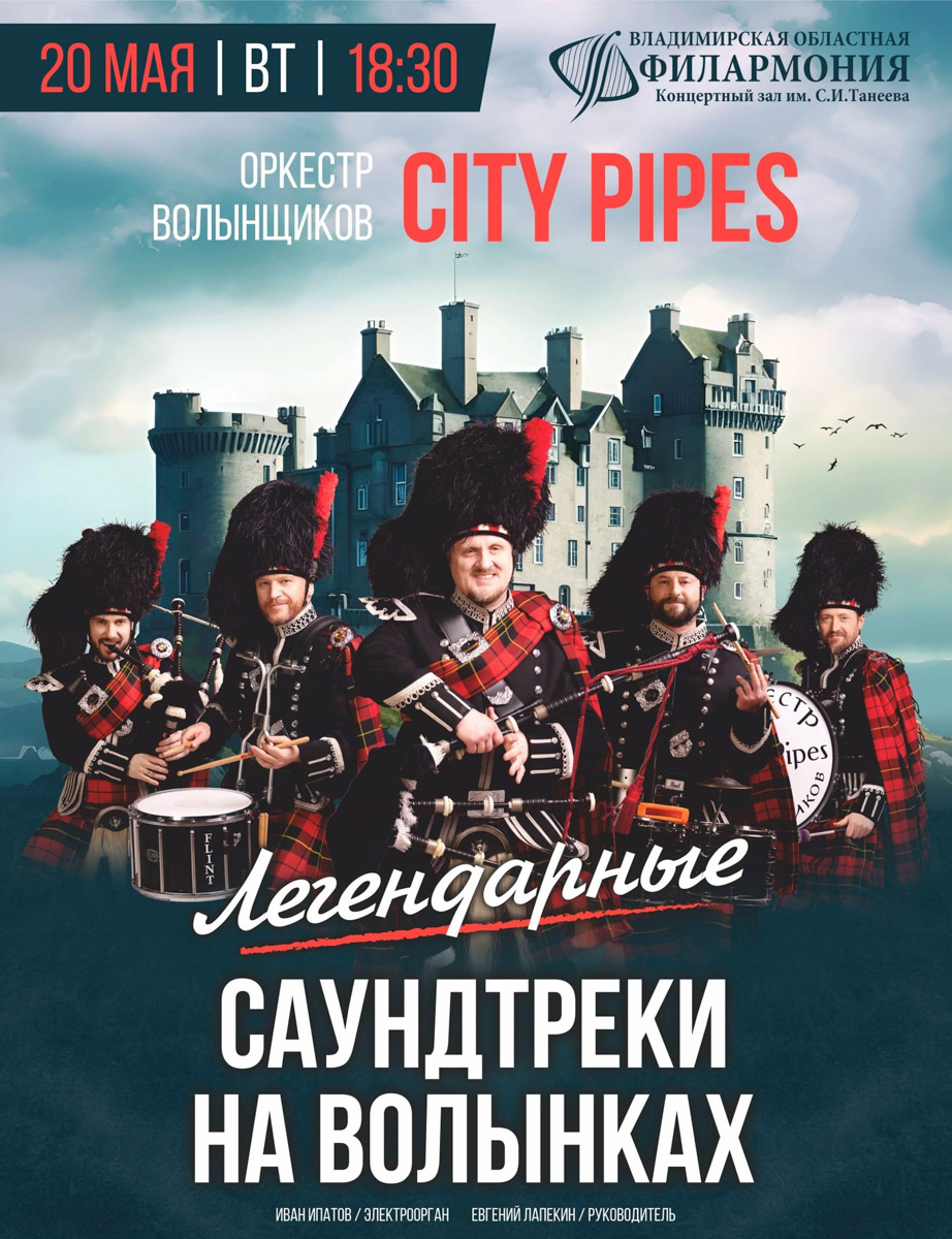 Встречайте новое шоу «Саундтреки на волынках»! На этом уникальном концерте звуки шотландских волынок и барабанов воссоздадут атмосферу любимых фильмов и перенесут зрителей в волшебные миры «Властелина колец», «Хроник Нарнии», а затем и в самое сердце удивительных событий, легенд и вымышленных приключений. Дополнят атмосферу шоу транслируемые на экране видеоинсталляции от художницы Анны Ивановой. Ее неповторимый стиль и талант придадут новые необычные оттенки музыкальному сопровождению, погружая в удивительные истории.