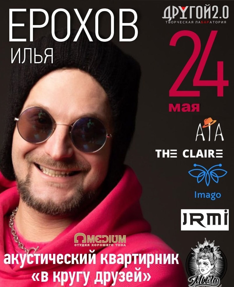 Акустический квартирник «В кругу друзей» — это душевный музыкальный вечер, который пройдет 24 мая. Илья Ерохов соберет единомышленников и поклонников теплой, искренней атмосферы. Зрителей ждут чистая акустика и живое общение. Поддержку Илье окажут представители творческих объединений и музыкальных проектов: ATA, The Claire, Imago, JRMI, Millo и Kreepshow. Не пропустите вечер музыки и дружбы!