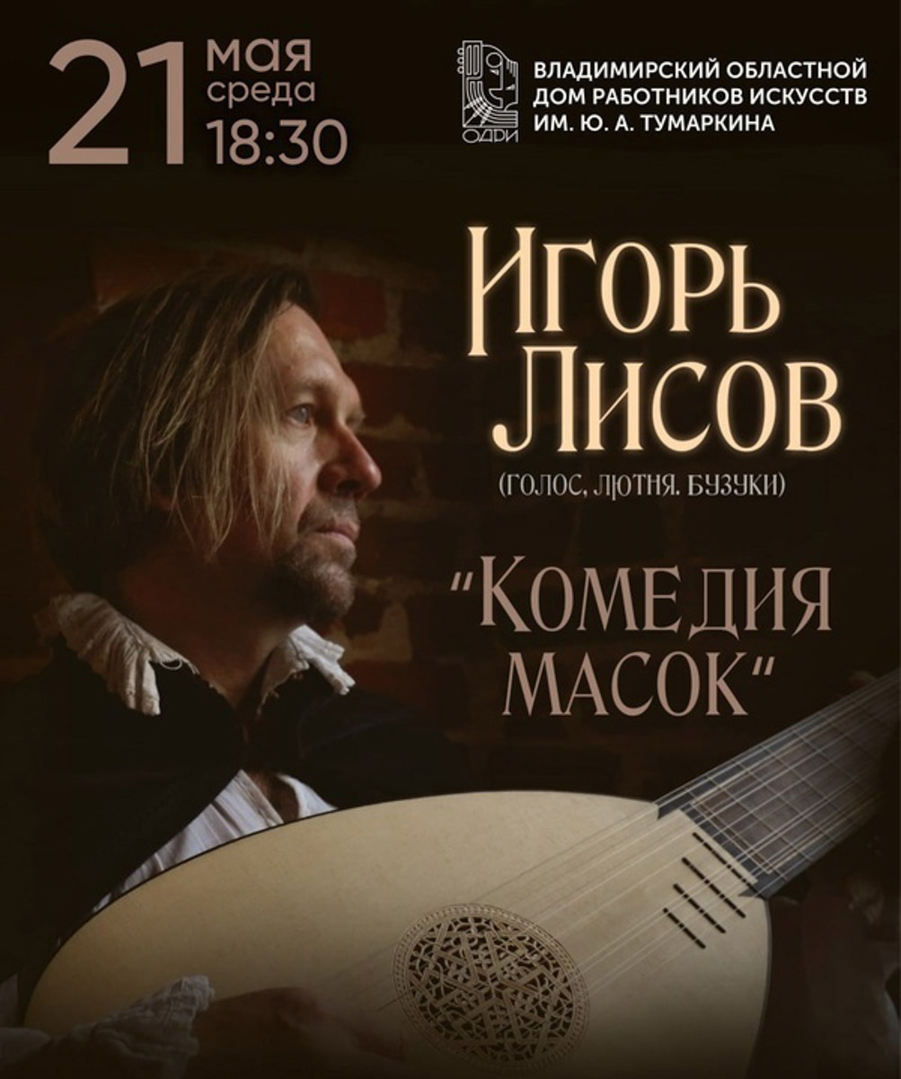 Игорь Лисов — лидер группы «Зеленые рукава» с 1993 года, выступал с петербургским академическим симфоническим оркестром, ансамблем старинной музыки Barocco Concertato, капеллой «Золотой век», группой «Отава Ё», в квартете с Владимиром Волковым и участвовал во множестве других интересных проектов. В программе «Комедия масок» прозвучат средневековые песни под лютню. Ведь то, что заботило людей пятьсот лет назад, остается актуальным и сегодня.