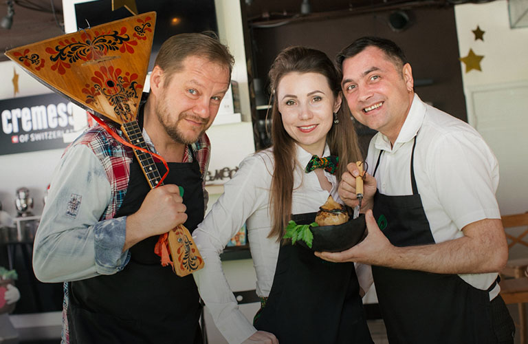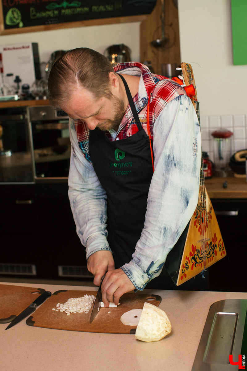 На кухне кулинарной студии Roulet Марья-искусница попыталась найти русскую печь. Служивый тем временем проверил – острые ли ножи, не спрятались ли в холодильнике Идолище Поганое или Баба Яга. А Дмитрий Орловский сочинял старую сказку на новый лад. Точнее, былинное блюдо в современной трактовке.