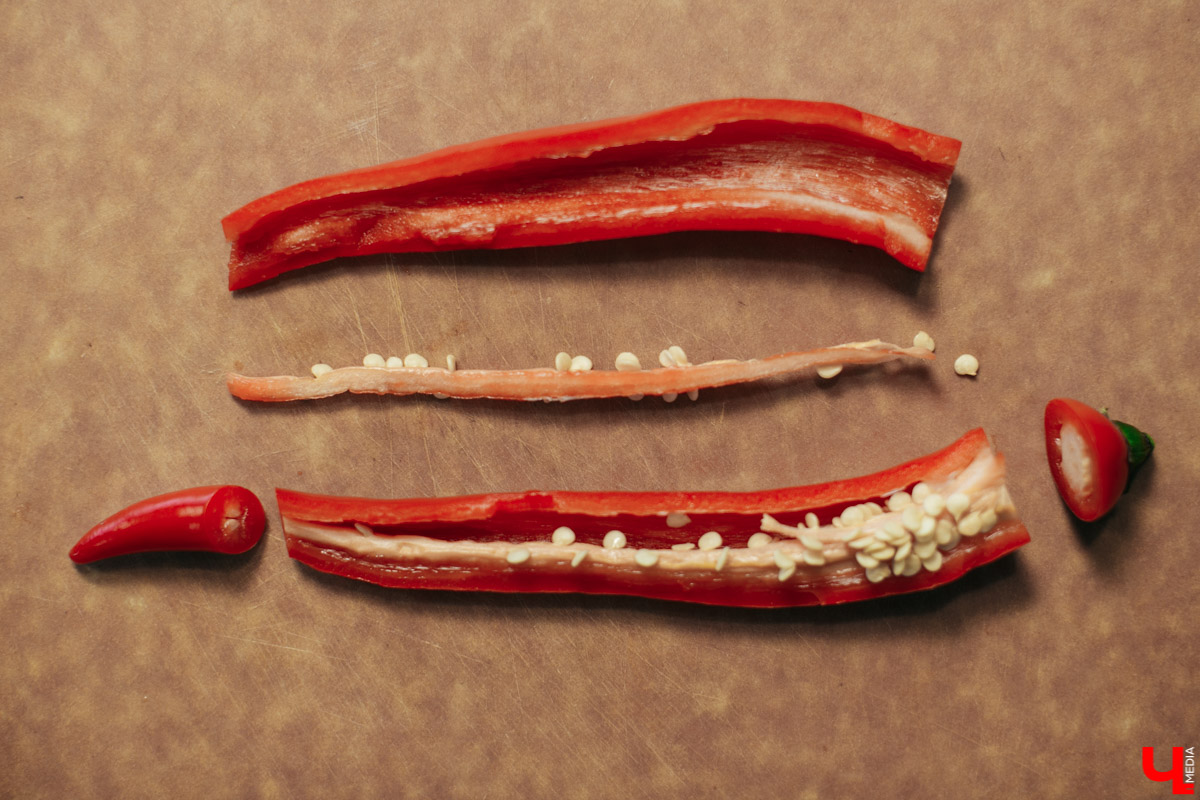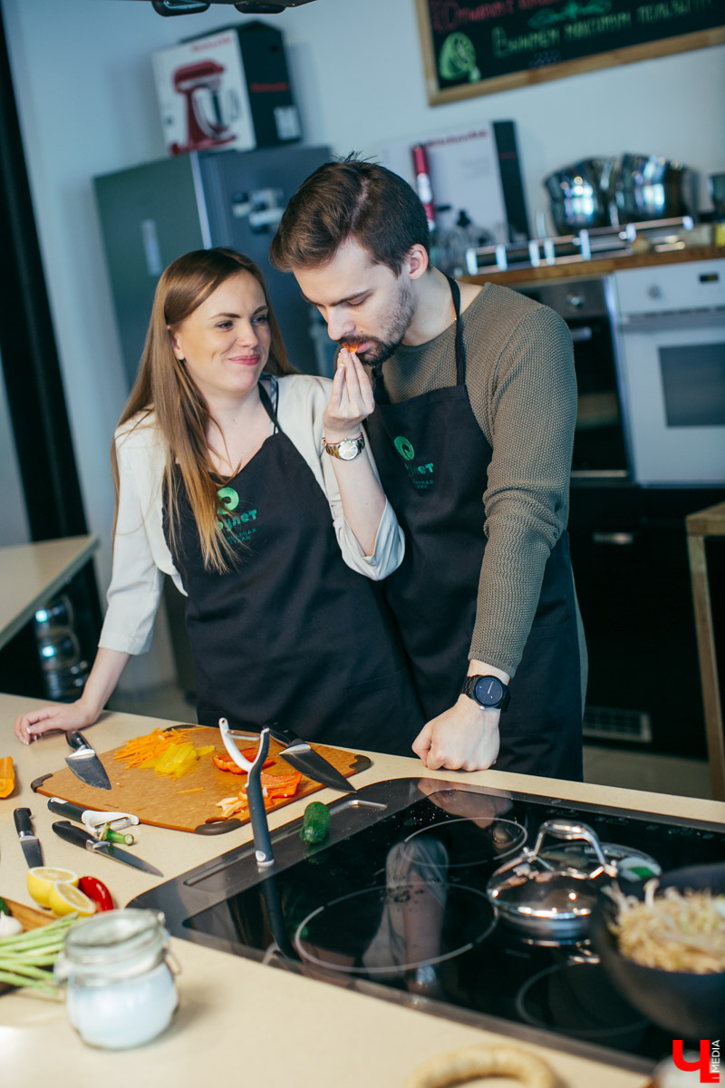 Надежда тем временем шинкует овощи. Это еще одна хитрость – нарезать все продукты одинаково тонкой соломкой. Внешне простое блюдо требует безупречного исполнения. К примеру, у спаржи необходимо отрезать жесткую часть стебля. Конечно же, Дмитрий не утаил от девушки секрет виртуозного нарезания сладкого перца. И острого тоже, который будет не таким уж нестерпимо жгучим, если помнить, что самые «огненные» части – те, к которым крепятся семена. Так что их лучше сразу аккуратно удалить.
