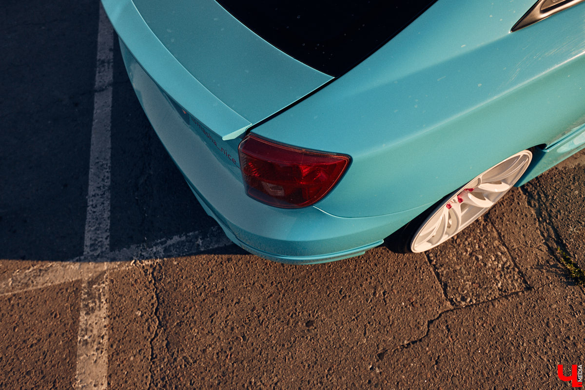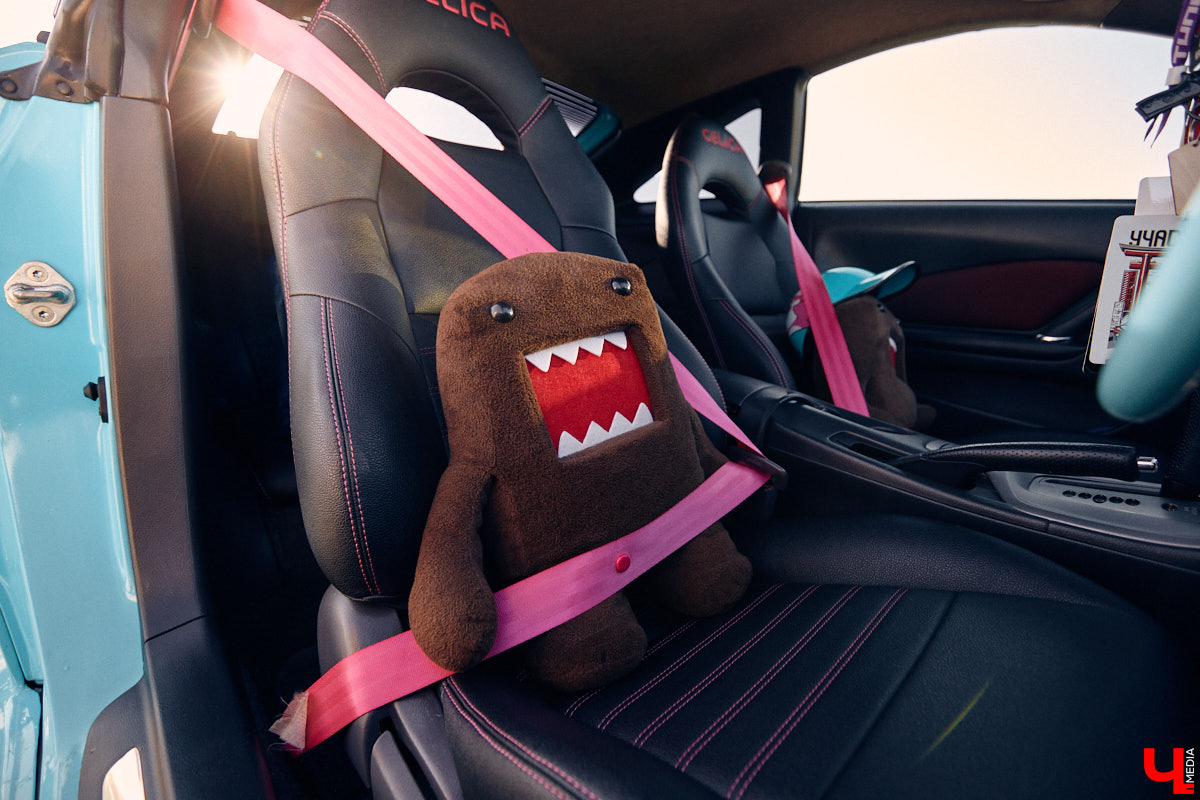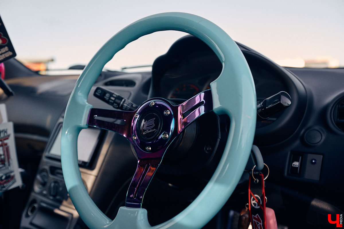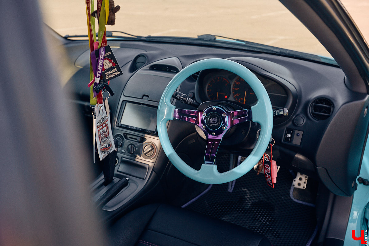 Кстати, машина вполне могла стать розовой, но Мария передумала и выбрала для нее бирюзовый оттенок, добавив нежный девчачий цвет в детали: гаечки, ремень и надписи в тон волосам хозяйки японского авто. Прежний салон, дорестайлинговый, серый и скучный, поменяла на черный, тоже, к слову, не без приключений, рассеяв темноту розовыми мелочами и ярким рулем.