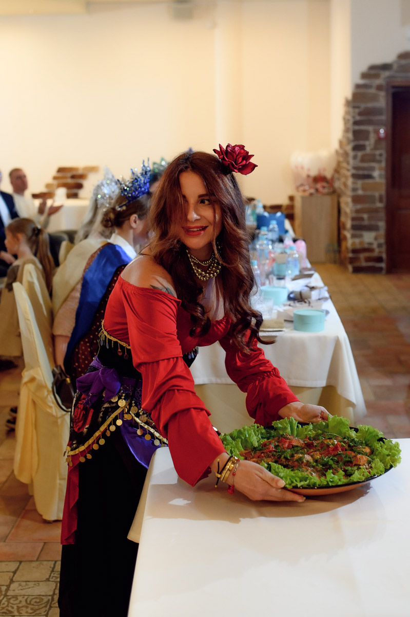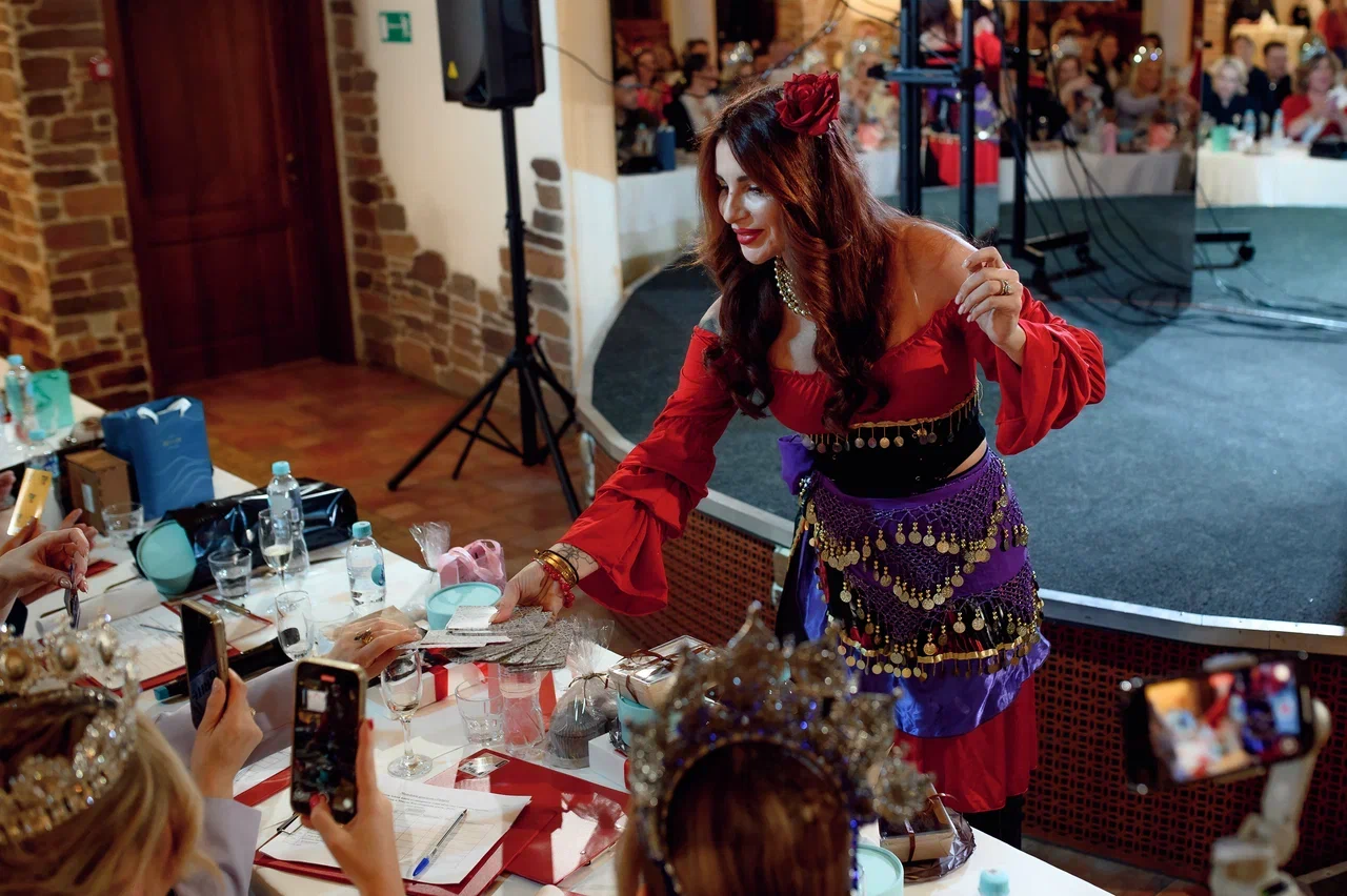 Участница категории «Миссис» Екатерина Машковцева не просто презентовала в ярком наряде цыганские голубцы, но и, как положено настоящей представительнице этой народности, погадала на картах членам жюри.