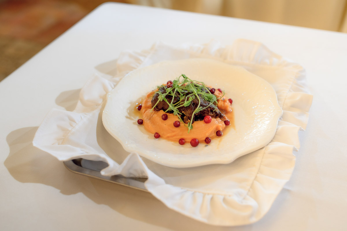 Эвелина Круглова перевоплотилась в эффектную парижанку, чтобы презентовать свой кулинарный шедевр — томленные в винном соусе телячьи щечки.