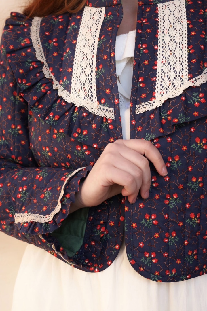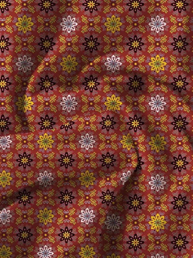 Рисунок повторяет ювелирную работу мастеров Александровского уезда Владимирской губернии рубежа XIX — XX веков и нанесен на ткань методом ротационной печати — при помощи сетчатых шаблонов.