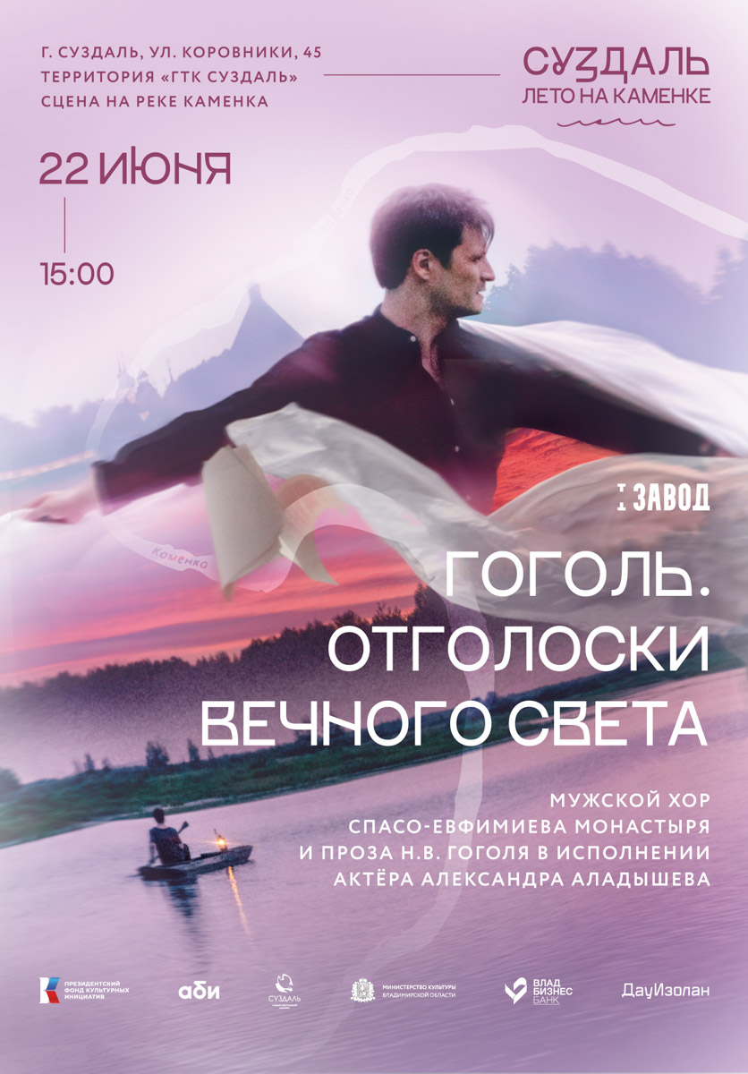 Театральное товарищество «Завод» продолжает мероприятия в рамках нового проекта «Лето на Каменке. Суздаль». В это воскресенье зрителей ждут выступление мужского хора Спасо-Евфимиева монастыря и проза Николая Гоголя в исполнении актера Александра Аладышева.