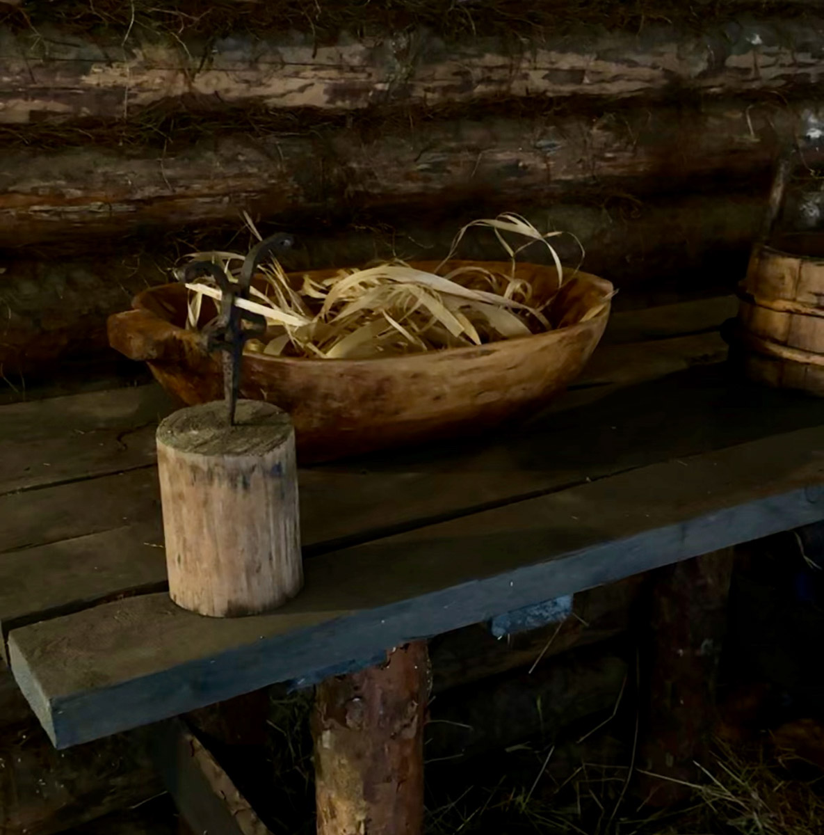 Среди множества интересных экспонатов представлен — светец на колоде, который использовали для освещения в бани. Интересный факт: лучина не слепила глаза в парной и продолжала гореть даже при высокой влажности. А еще печь-каменка без дымохода, рубель, валёк и многое другое можно увидеть в музее бани по-чёрному в «Щурово городище».