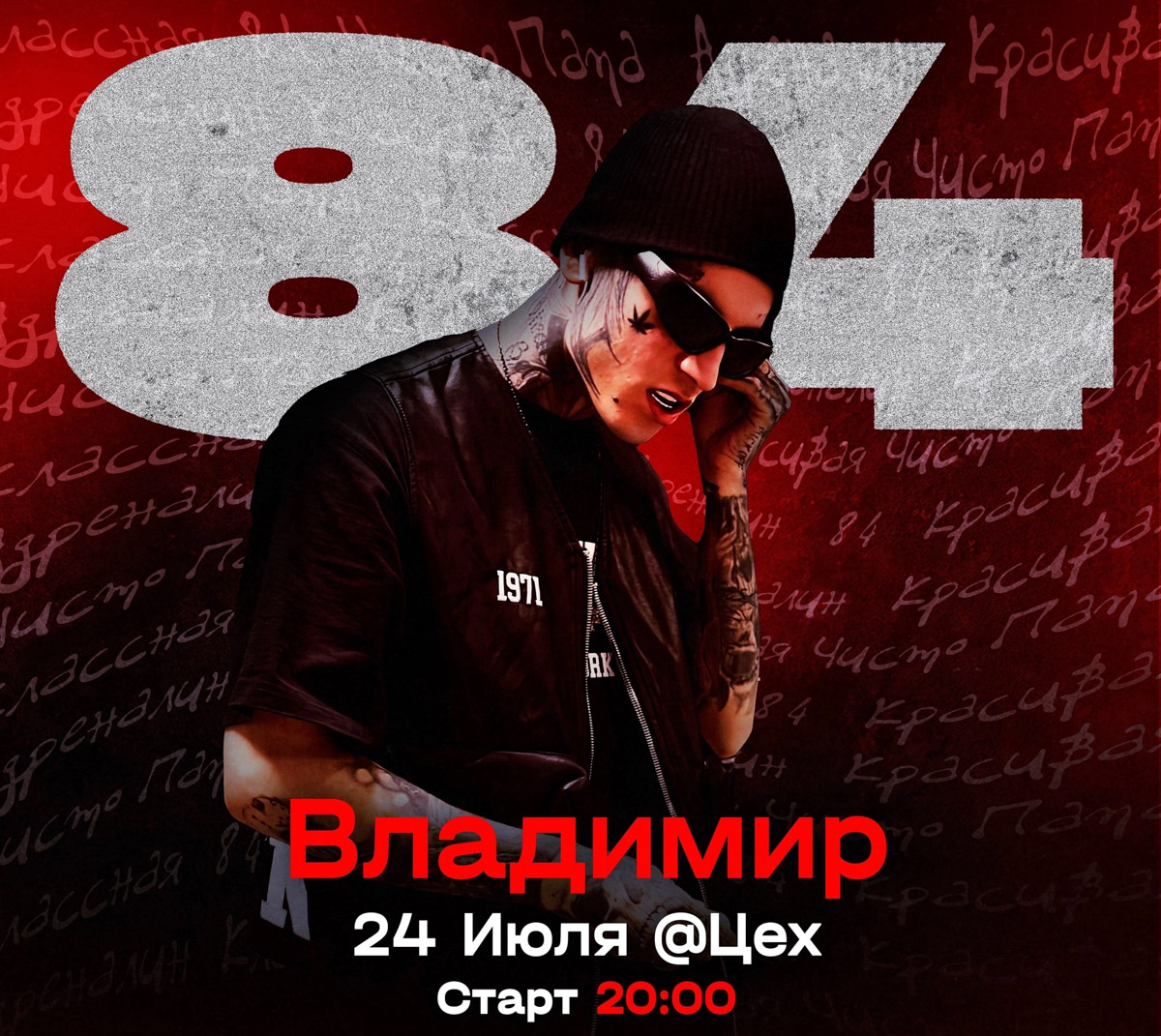 Дмитрий Малакмадзе, более известный как 84, — российский рэпер родом из Амурской области. Он начал карьеру в хип‑хоп сообществе Hood 84, а популярность пришла к нему после хитовых треков «Классная», «Чисто папа» (feat. Lookbuffalo), «Голая» (feat. tet baby), «Драгоценность» и «Красивая». В марте 2022 года вышел сингл «Кругом голова» совместно с Volodya XXL и Lookbuffalo, который принес ему широкое признание. Его музыка — это сочетание честных текстов, мелодичности и современной хип‑хоп культуры.