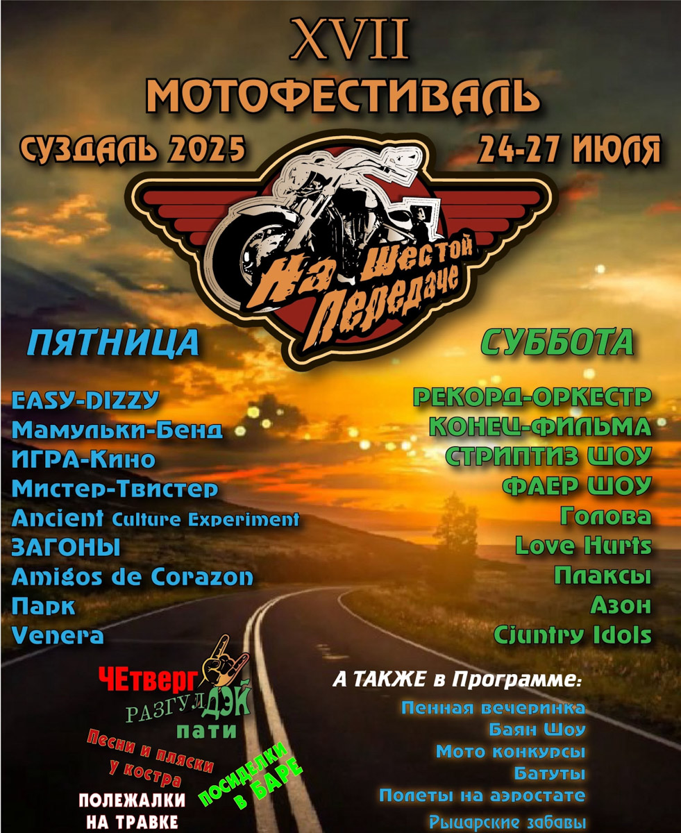 Владимирских зрителей ждет настоящее музыкальное изобилие. Под Суздалем стартует XVII мотофестиваль «На шестой передаче» с живыми выступлениями, конкурсами и атмосферой свободной дороги. На пляже Переханово в Ковровском районе пройдет open air с концертом Косты Лакосты. В программе музыка, пена, вода и шум лета. А во владимирском клубе Katar соберутся те, кому тесно в жанровых рамках: на Badyn Fest выступит Стас Барецкий и не только.