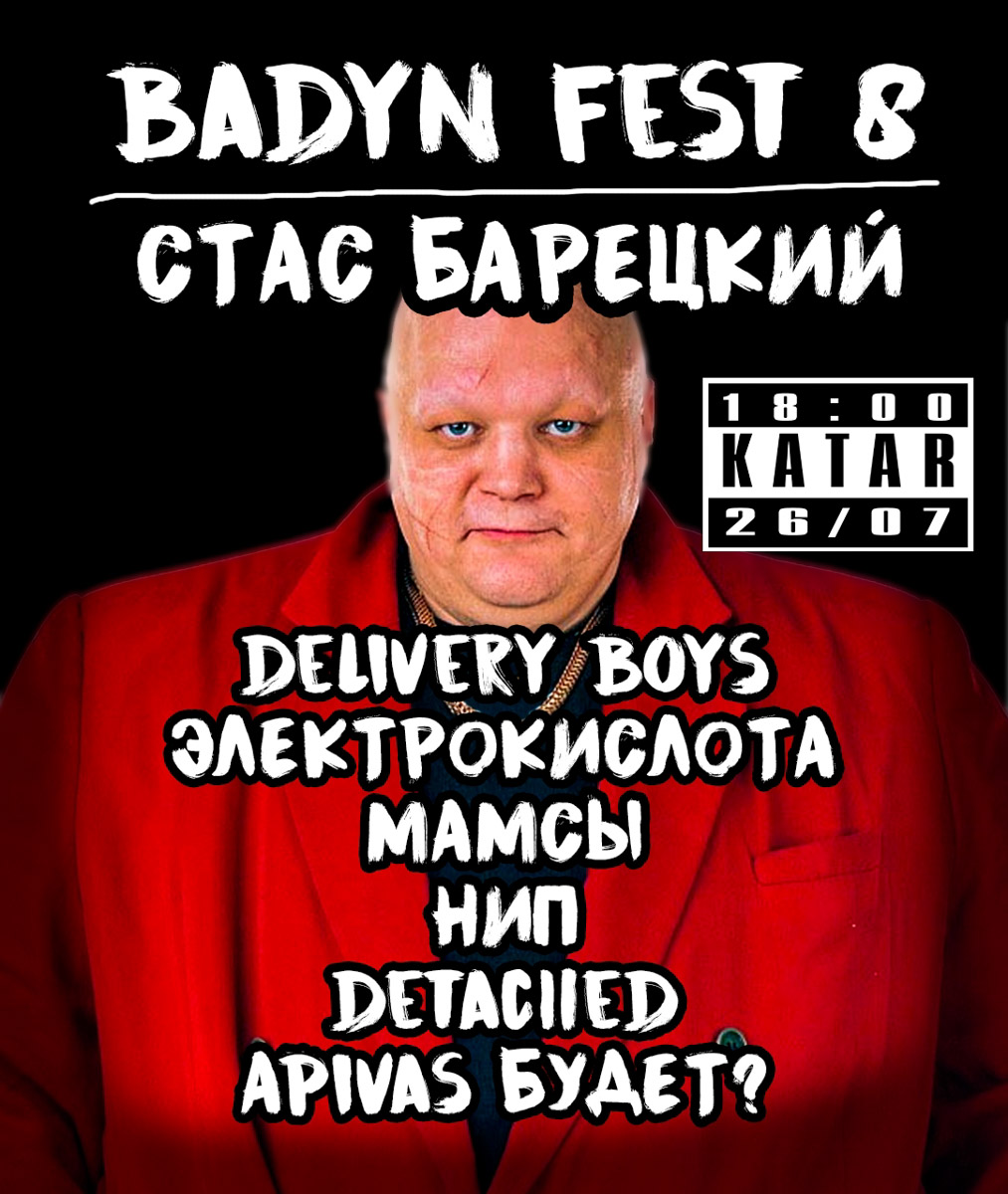 В пространстве клуба Katar состоится одно из самобытных мероприятий лета — Badyn Fest 8. Главным хедлайнером станет культовая фигура российской сцены — Стас Барецкий, артист, способный превратить любое выступление в перформанс на грани музыкального и театрального. Зрителей ждут выступления групп Delivery Boys, «Электрокислота», «Мамсы», «Носок игривой псины», Detached и других участников, чье звучание варьируется от панка до экспериментального рока.