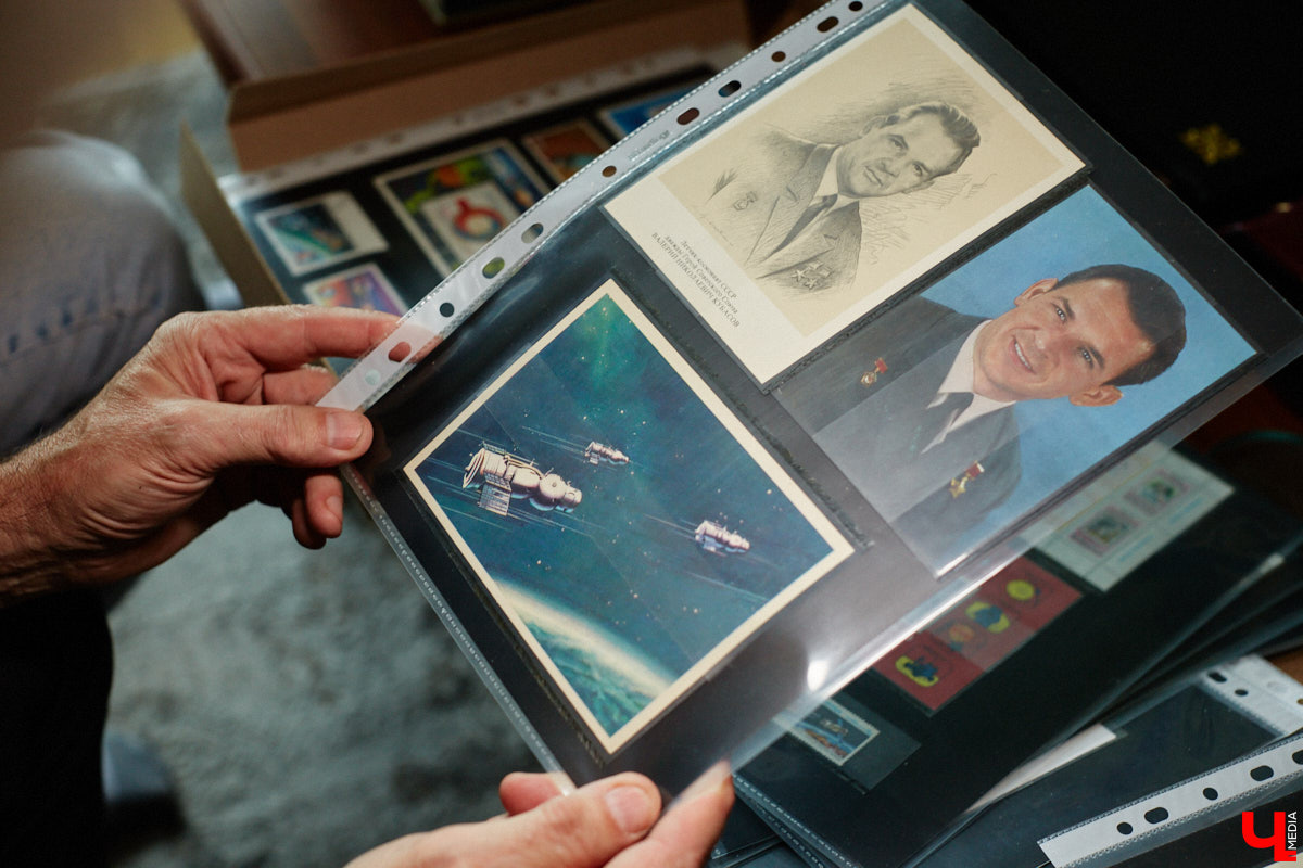 На столе филателиста Александра Корнилова лишь несколько альбомов с марками, конвертами и открытками, которые он приготовил для съемок. Большая часть коллекции разместилась в шкафах и на полках. Чтобы все внимательно рассмотреть, не хватит и суток! Одних только почтовых карточек с изображением Валерия Кубасова больше десятка, а недавно к ним добавилась еще одна, выпущенная ограниченным тиражом по случаю его юбилея.
