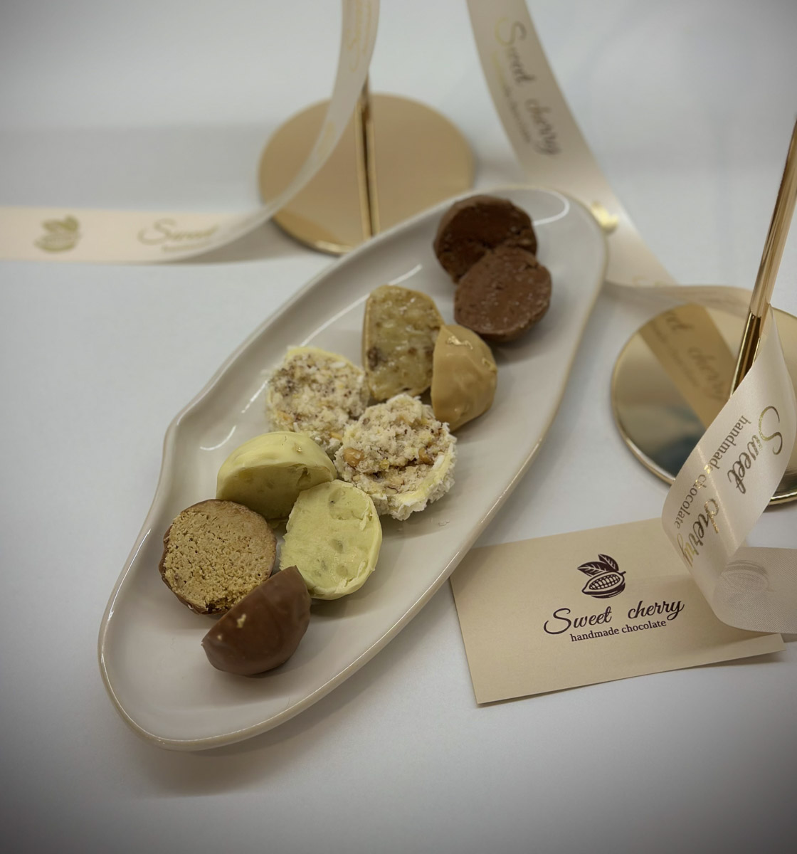«Если говорить об авторских сладостях, корпусные конфеты не так привлекательны, как трюфели с разнообразными вкусами. Мы с детства привыкли к ассорти конфет из коробки — угадай, какая начинка попадется. Но премиальная версия таких конфет стоит довольно дорого, хотя и выглядит как серийная продукция. Я размышляла, анализировала, почему круглые трюфели при схожей цене более востребованы. Почему-то я верю, что именно форма играет определенную роль. К примеру, я училась в Москве готовить нарезные конфеты. Купила резак, у меня есть всё для их изготовления. Попробовала сделать трюфели с сыром дорблю, многолетний хит продаж, в форме куба. Не пошли. Хотя на их плоскую поверхность можно еще и орешек положить, будет эффектно. Потом, изучая психологию, я поняла, что поскольку круг означает дружбу, добро, лишен острых углов, этим он нас и привлекает. Четкая психология».