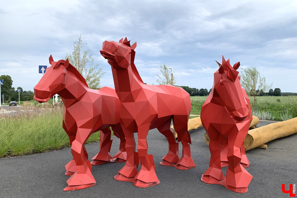 Тройка красных владимирских тяжеловозов встречает гостей на въезде в Гаврилов Посад. Арт-объект своего рода визитка, ведь городок в Ивановской области называют родиной известной на весь мир породы. Он находится примерно в 30 километрах от Суздаля. Дорога туда хорошая и проходит вдоль живописных деревенек и полей с золотыми колосьями — идеальный фон для летних фото.