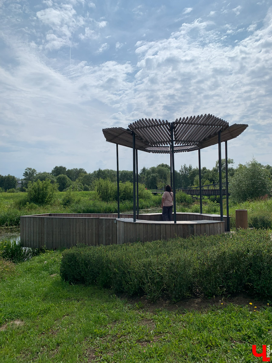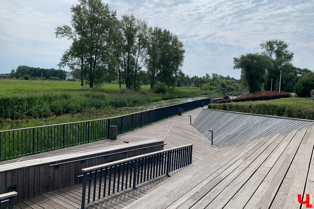 Проект набережной реализовало архитектурное бюро SPACES. Ее очертания стремятся повторить изгиб небольшой реки с поросшими камышом берегами. Там вы не увидите привычной жителям Владимира серой брусчатки. Есть небольшой островок, но и тот выделяется дизайном в виде многоцветного лоскутного одеяла как что-то трогательное и душевное. Деревянное покрытие широкой лестницы, ведущей к Воймиге, и дорожки, прокладывающей маршрут между деревьями и симпатичными, как бы естественными цветущими островками, создает теплое, почти тактильное ощущение уюта.