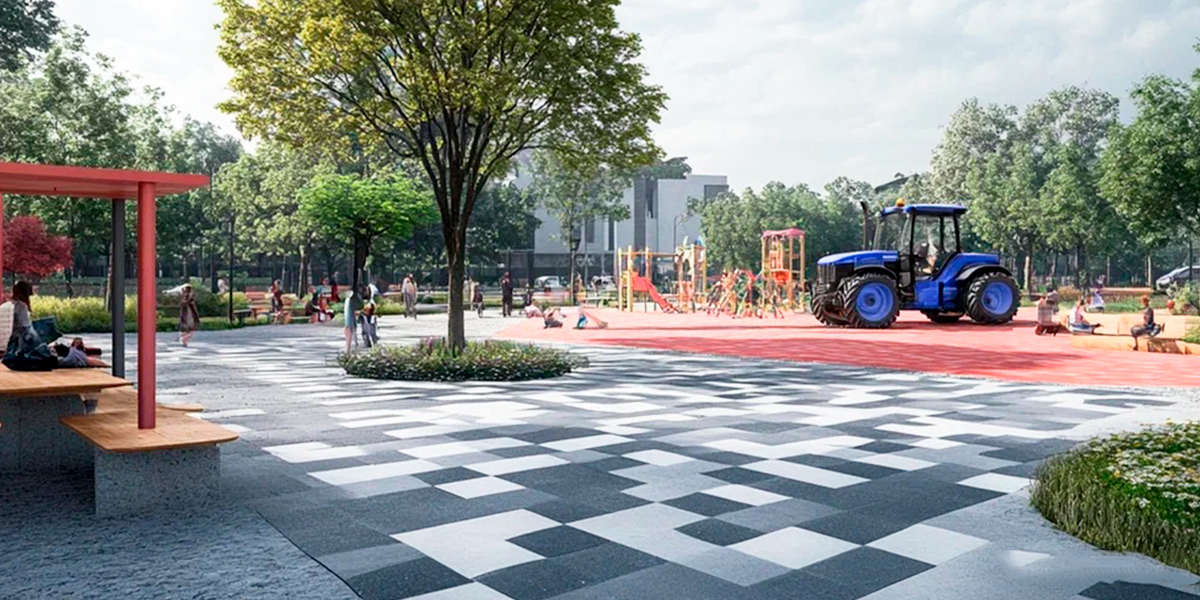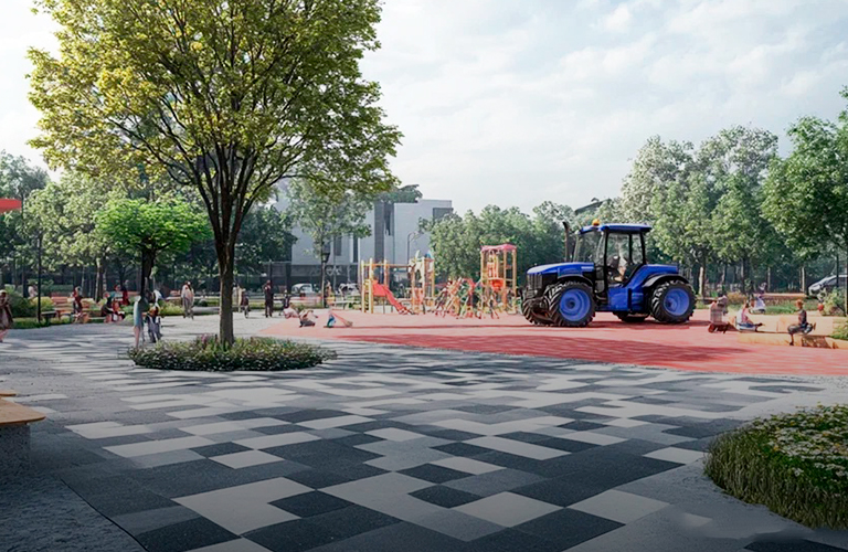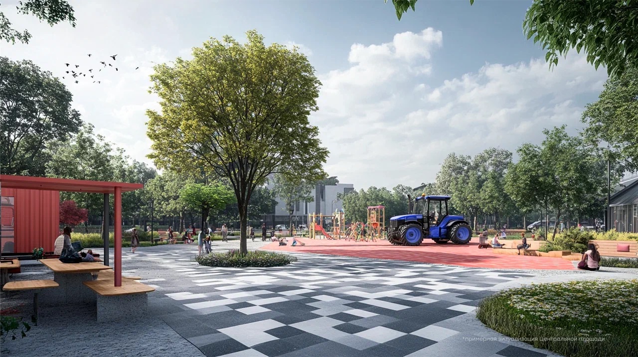 Главный принцип формирования центральной площади — использование тракторных паттернов в мощении тротуарной плиткой и расположение элементов по принципу ортогональной сетки, то есть перпендикулярно друг другу под прямыми углами. При этом все пространства различаются по уровню «публичности-приватности». С помощью ландшафтного дизайна формируются необходимые открытая и закрытая зоны. Акцентными элементами станут ель и собранный на ВТЗ трактор, установленный в качестве арт-объекта, отсылающего к славной истории завода.