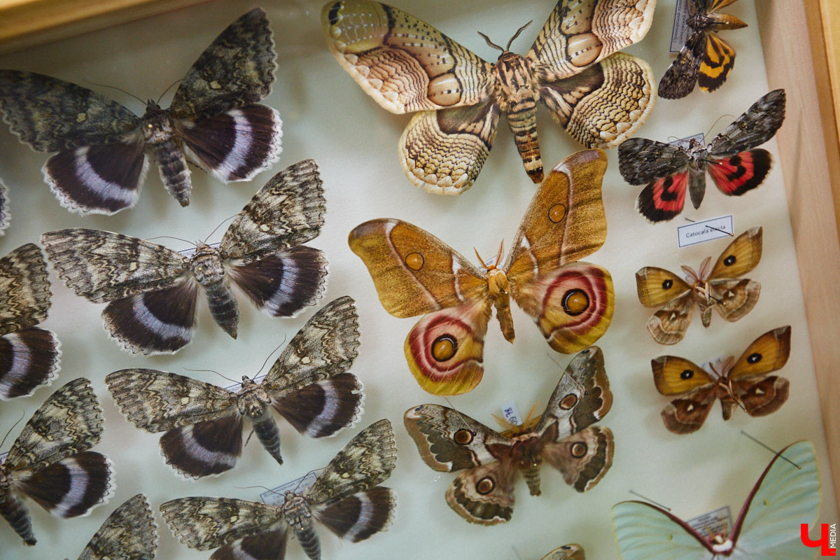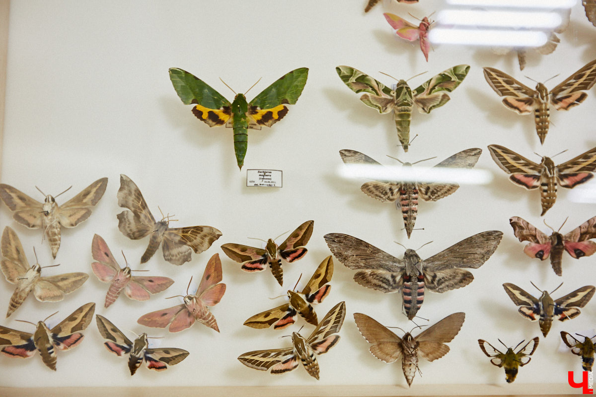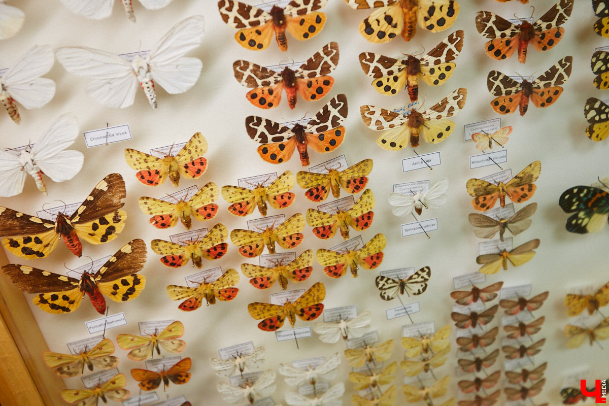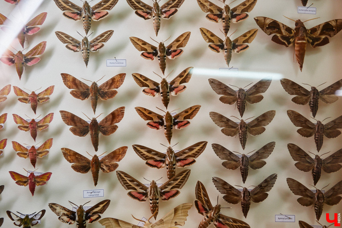 Еще одна страсть нашего героя — насекомые. В частности, бабочек он начал изучать в десять лет, а сейчас его коллекция насчитывает больше сотни видов! В музее представлены и местные красотки, и удивительно раскрашенные природой экзотические экземпляры. У некоторых на крыльях можно заметить яркий рисунок для отпугивания птиц. Например, цепляет взгляд бражник глазчатый и узнаваемая «мертвая голова».