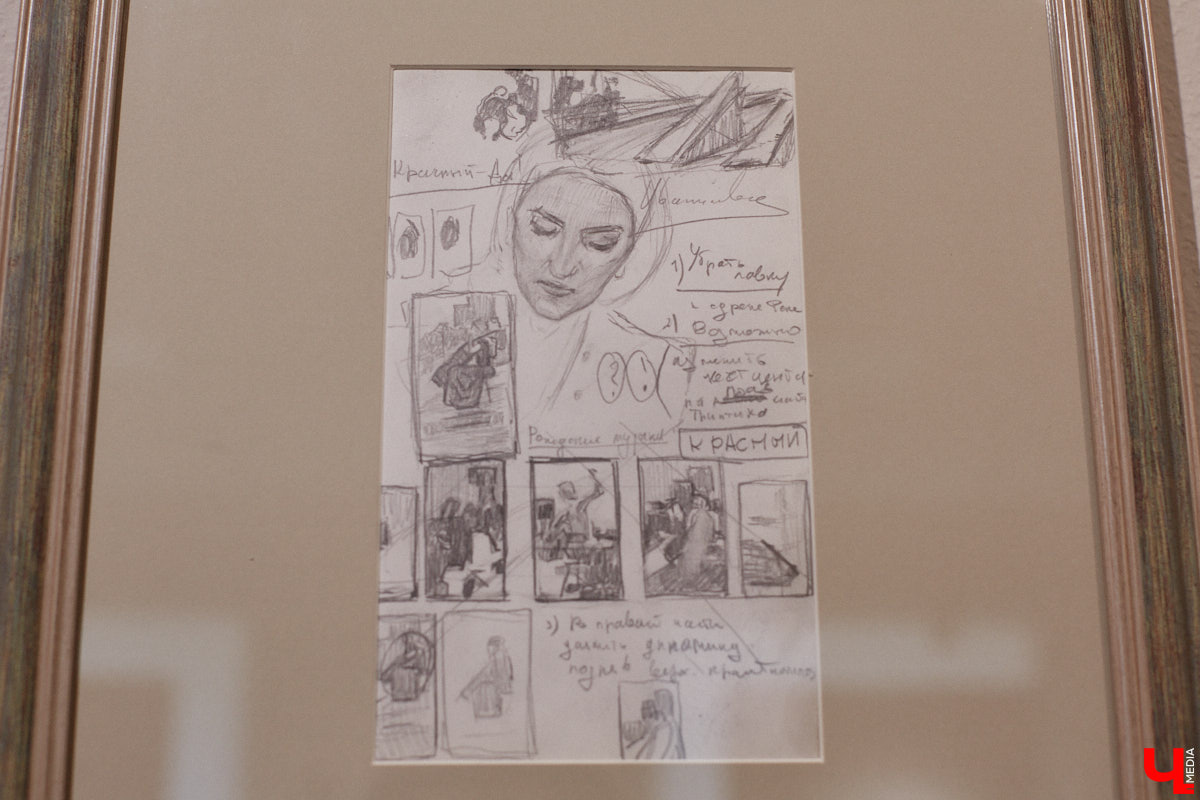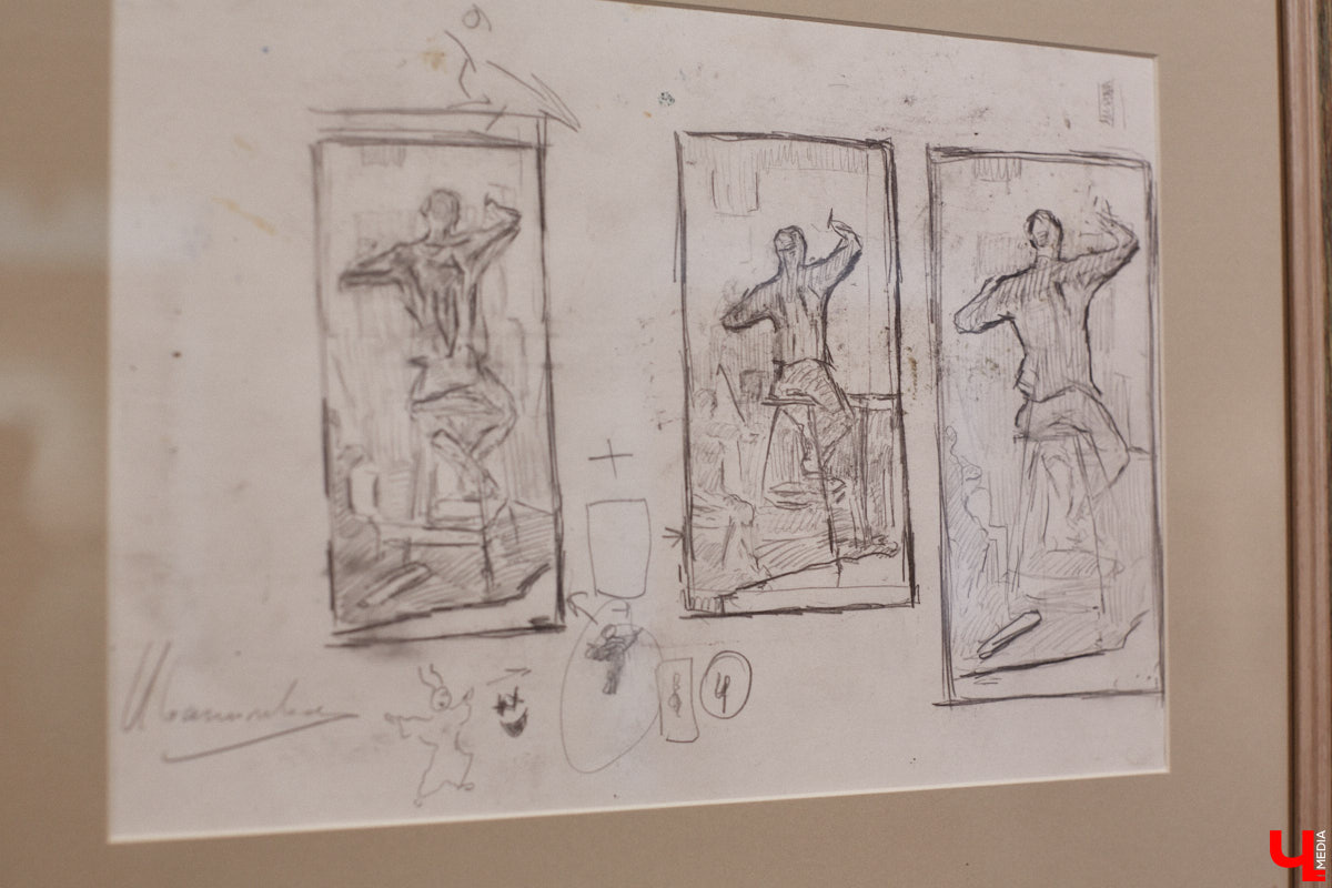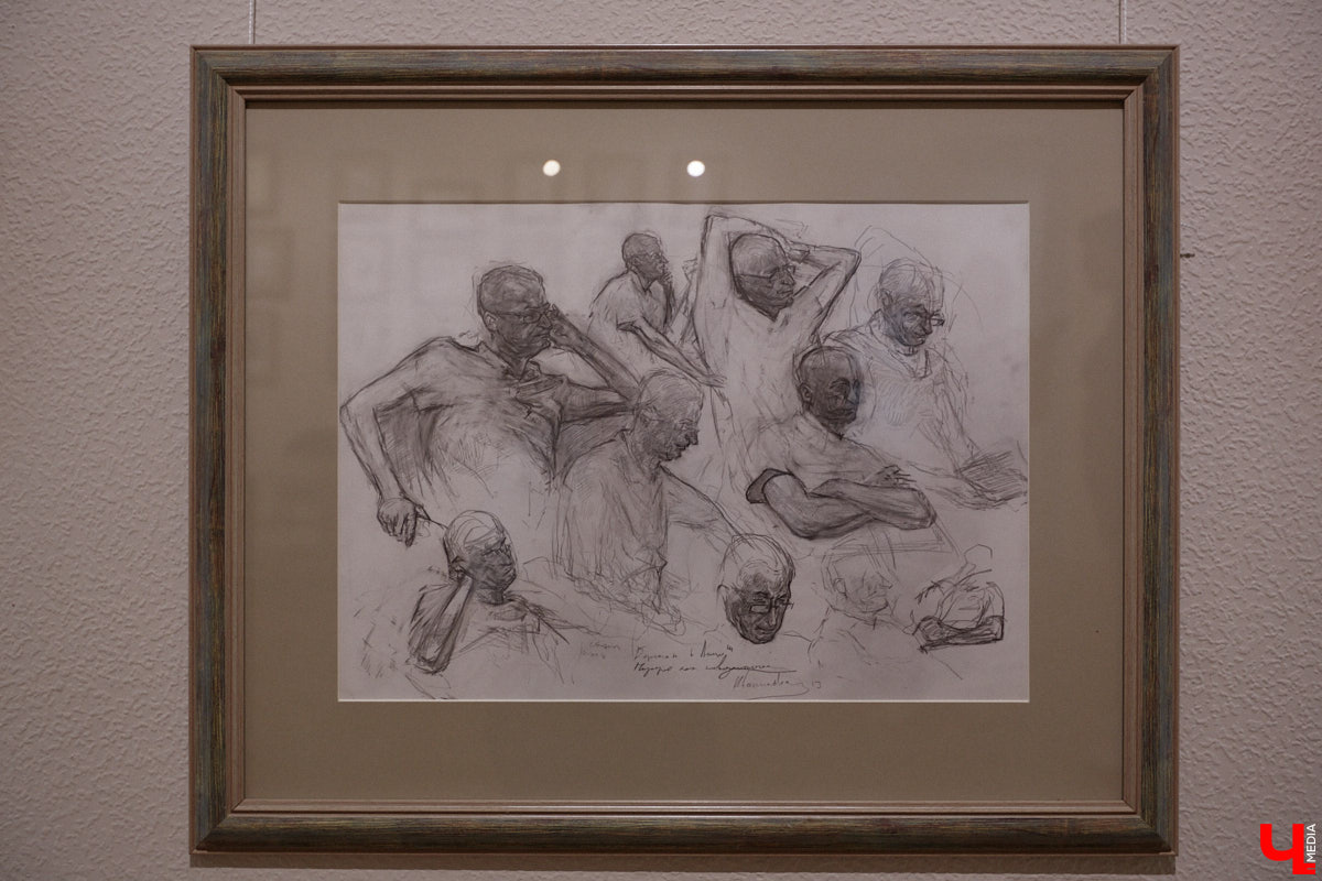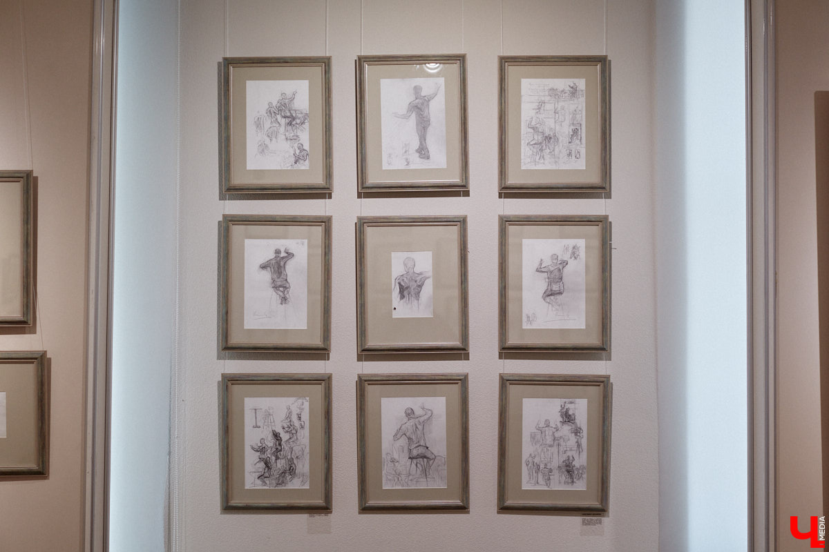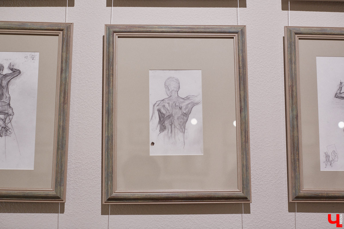 При этом найти нужную позу, на которой держалась бы вся работа, оказалось непросто. На выставке имеются пробные зарисовки. Вроде бы все тоже самое, но малейшее отклонение корпуса — и впечатление от картины разваливается. Разница может быть минимальной, но именно детали влияют на восприятие.