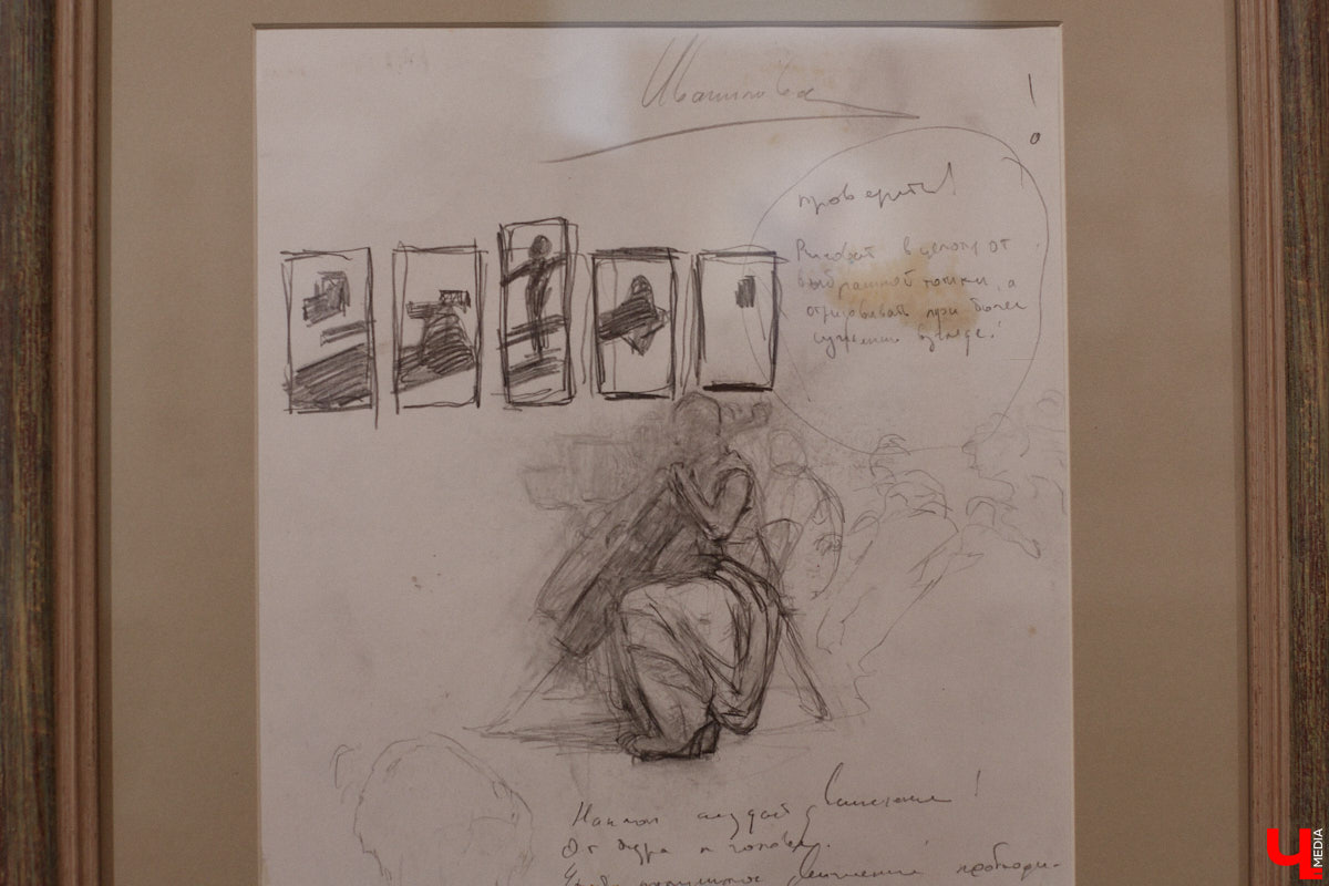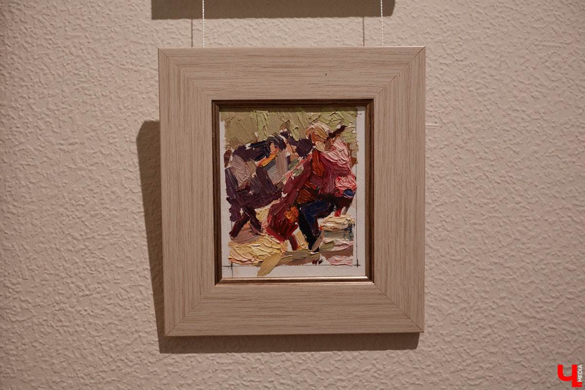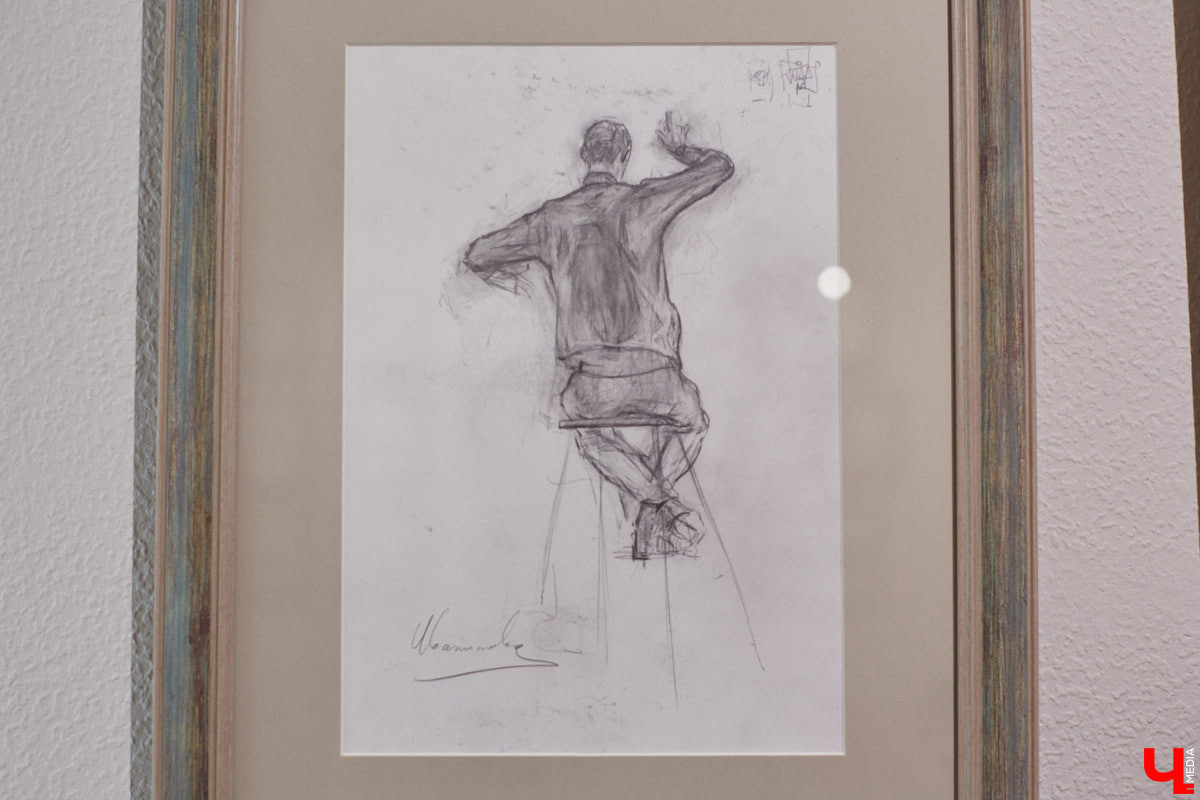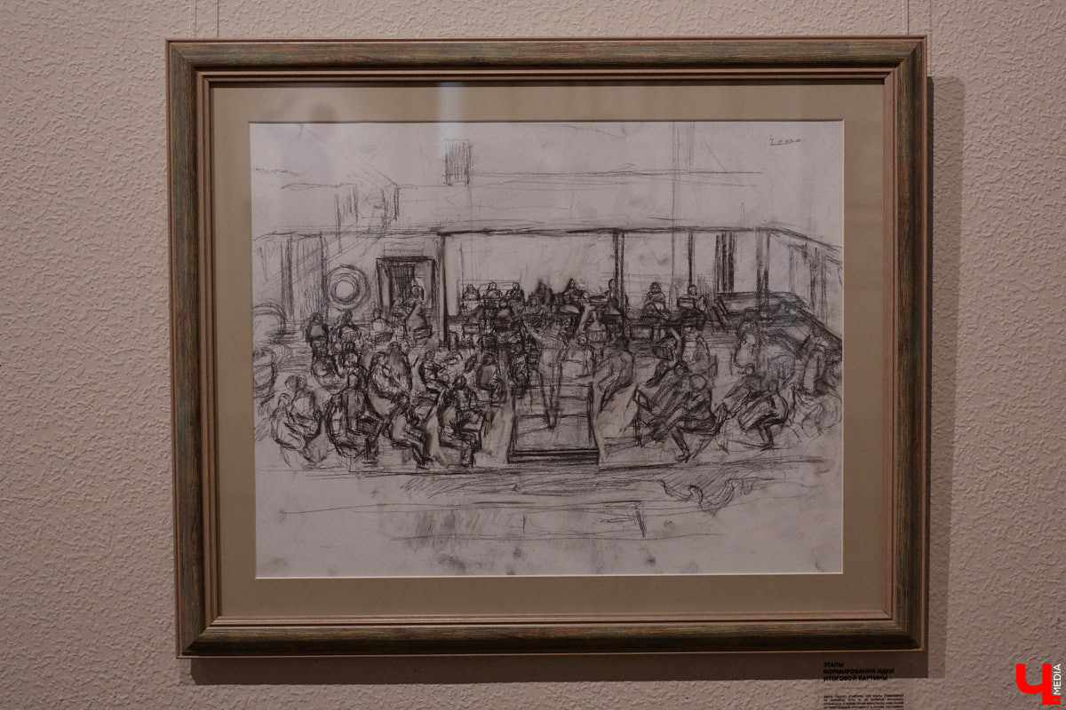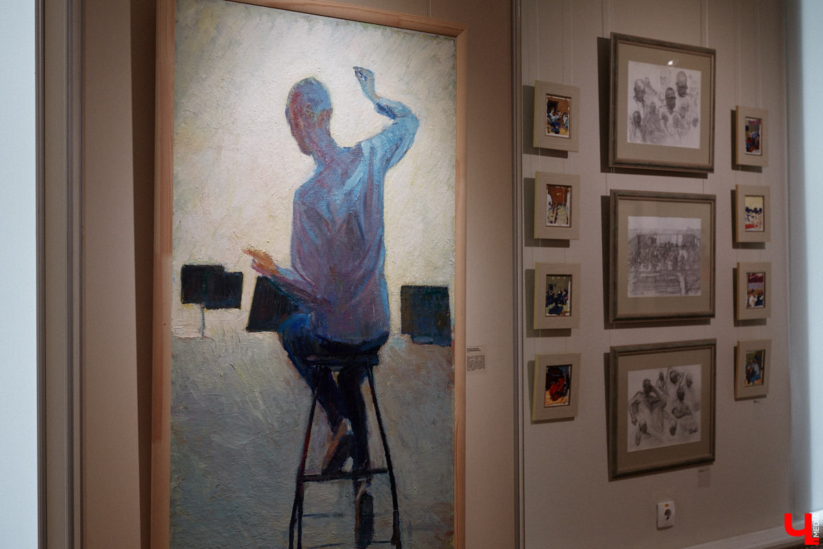 При этом найти нужную позу, на которой держалась бы вся работа, оказалось непросто. На выставке имеются пробные зарисовки. Вроде бы все тоже самое, но малейшее отклонение корпуса — и впечатление от картины разваливается. Разница может быть минимальной, но именно детали влияют на восприятие.