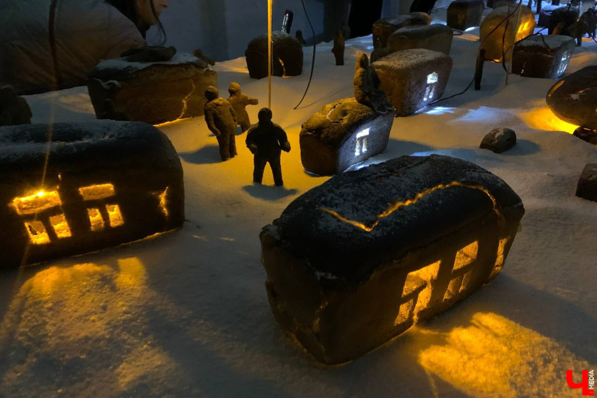 Один из залов буквально наполнен детскими воспоминаниями Леши — почему-то именно так звали Леонида Тишкова в родном городе. Макет занесенного снегом вечернего города светится уютными огнями. Присмотревшись, в домах зритель узнает буханки хлеба. А белый покров — самая настоящая соль. В уголке зала скромно пристроился старый чемодан. На крышке — фотография родителей художника, а на дне, конечно, свет как метафора памяти. И совсем трогательно на стене в авоське сияет пойманная звезда.