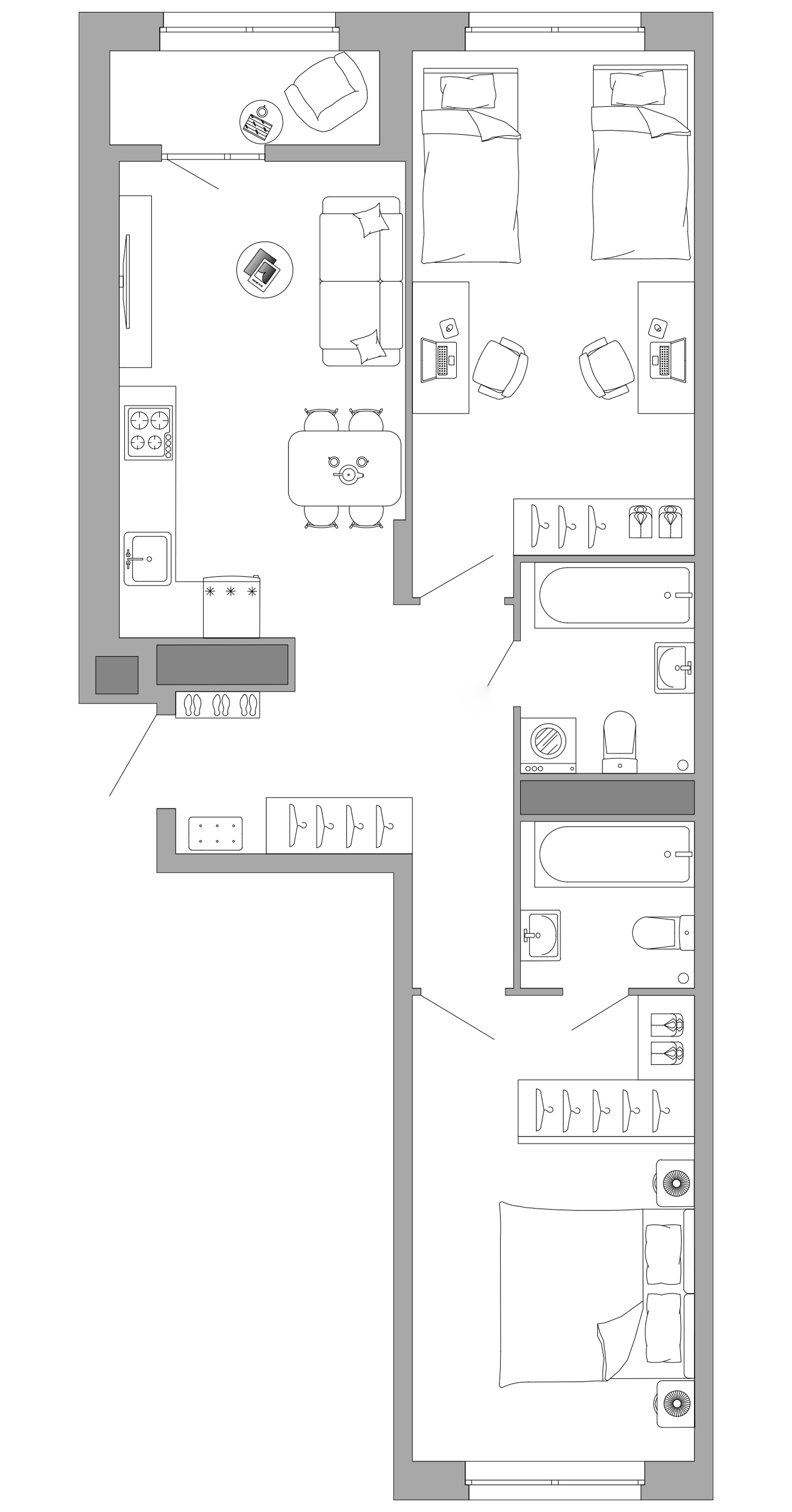 Кроме того, доступны варианты с мастер-спальней, где предусмотрены дополнительная ванная комната и просторная гардеробная.