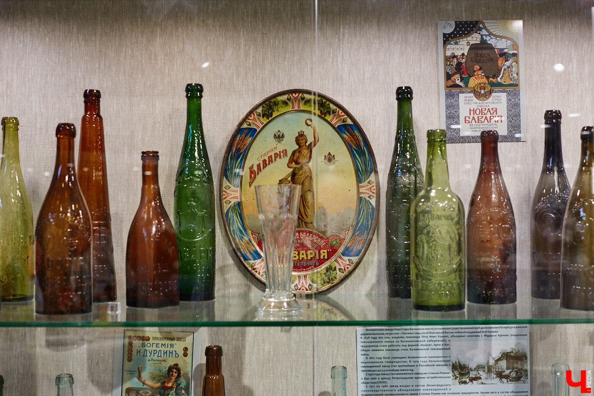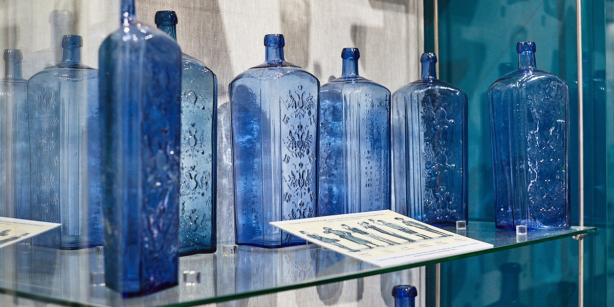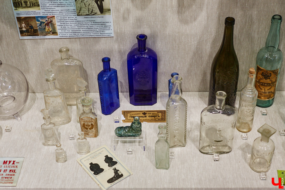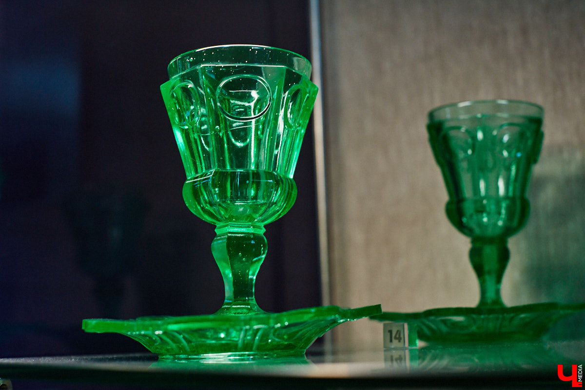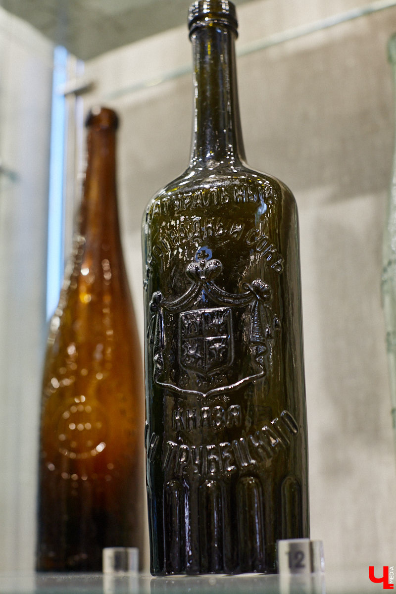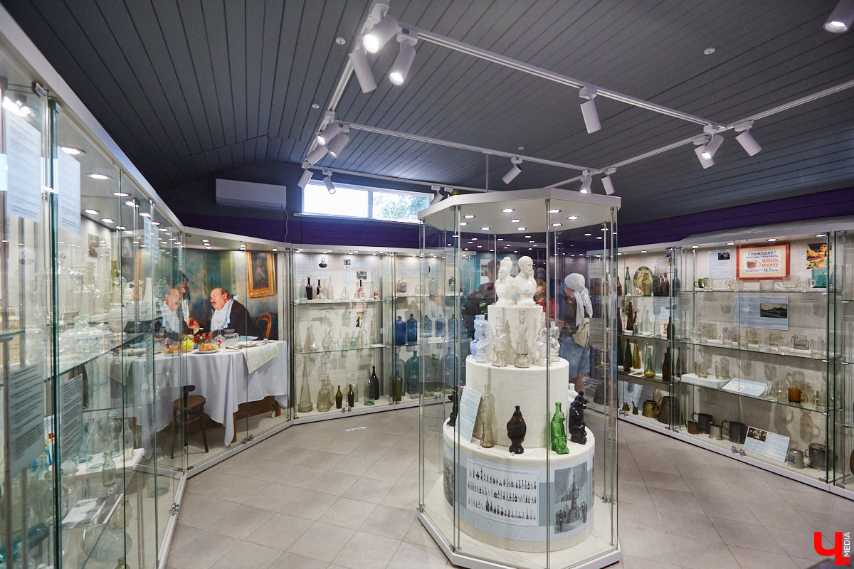 А вот настоящая бутылка с этикеткой XIX века. Внутри настой, который так и не выпили. Теперь она стоит в Суздале. Или флакон с урановым стеклом: его делали на мальцовских заводах с добавлением очищенного урана. Самое изделие безопасно, к тому же необычайно красиво: в ультрафиолете емкость светится изнутри. Таких здесь целая витрина!