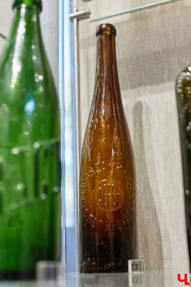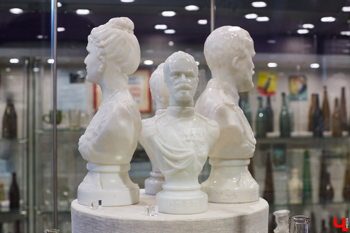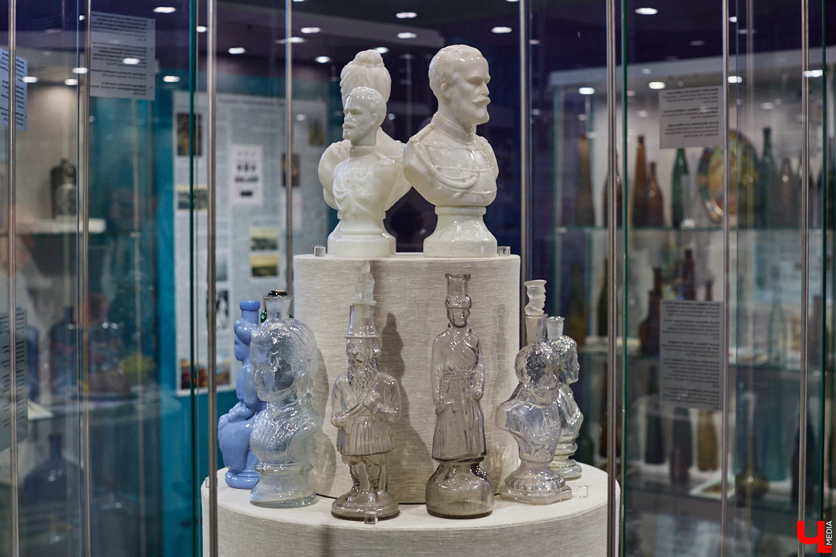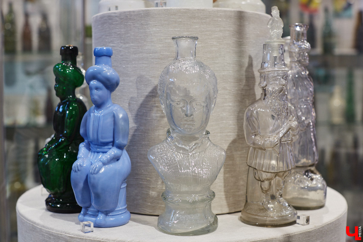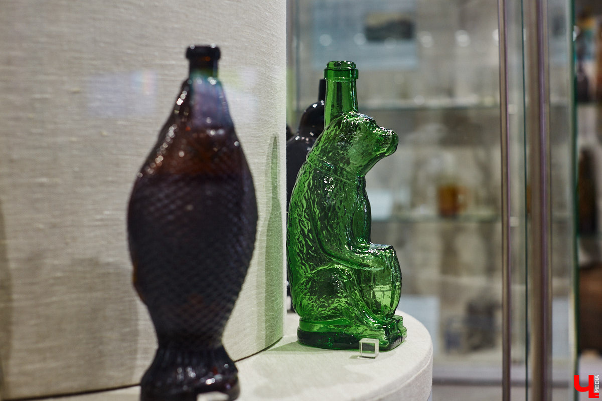 Например, бутылки в виде бюстов императора Николая II, Александры Федоровны, княгини Ольги. Или фигуры медведей — редкий дизайн, который использовали только два человека, купцы Смирнов и Шустов. Считалось, что цвет фигурки говорит о качестве содержимого: чем насыщеннее оттенок, тем оно выше. И если самые темные экземпляры еще можно с трудом найти у коллекционеров, то зеленый вариант, который представлен в музее, — редкая и уникальная вещь.