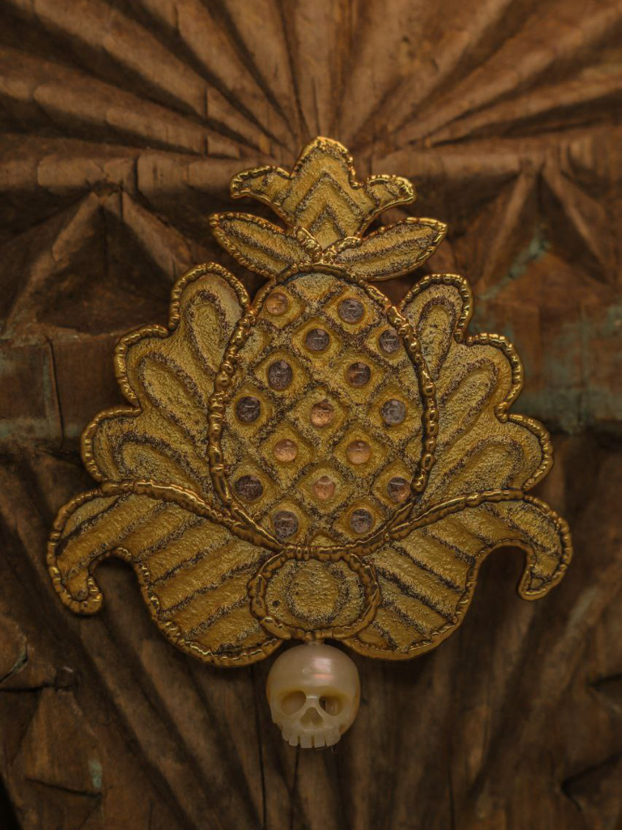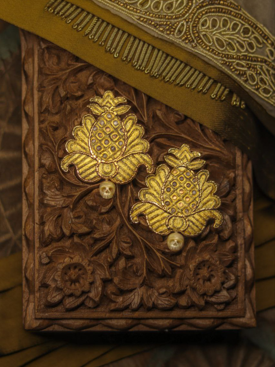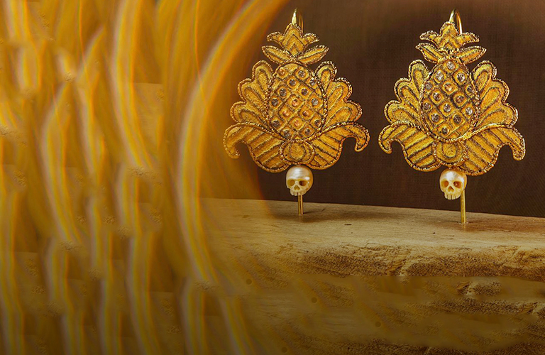 «Именно орнаменты старинных тканей и вышивка XVIII — XIX веков послужили источником вдохновения для серии украшений, таких как эти серьги. Золотой цветок стал олицетворением цветущей души, а жемчужный череп воплотил тело человека. Пара отражает вечные вопросы существования и духовности, их неразрывной связи между собой. Авторская методика нанесения эмали и гальванопластика позволили создать эффект золотной вышивки и набойки. Каждая серьга завершается резной вручную жемчужиной», — рассказал о своем творении под названием «Древо познания» ювелир.