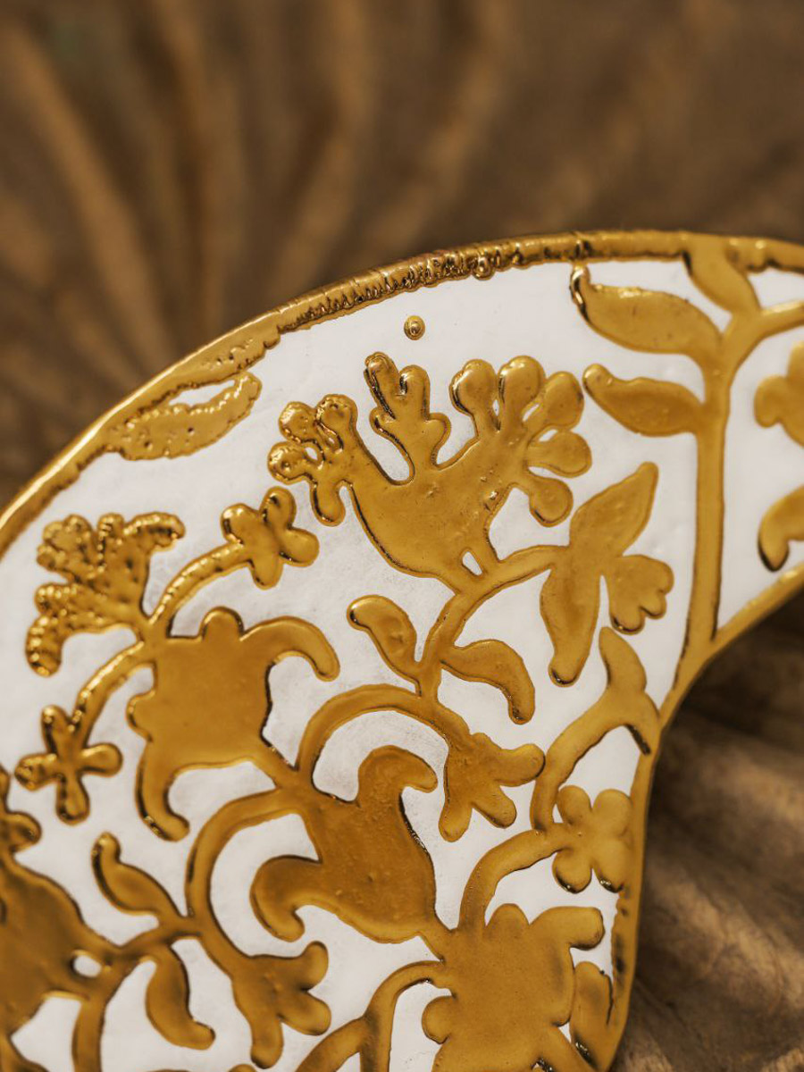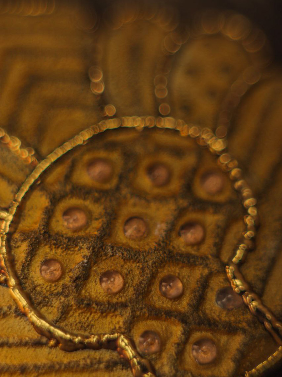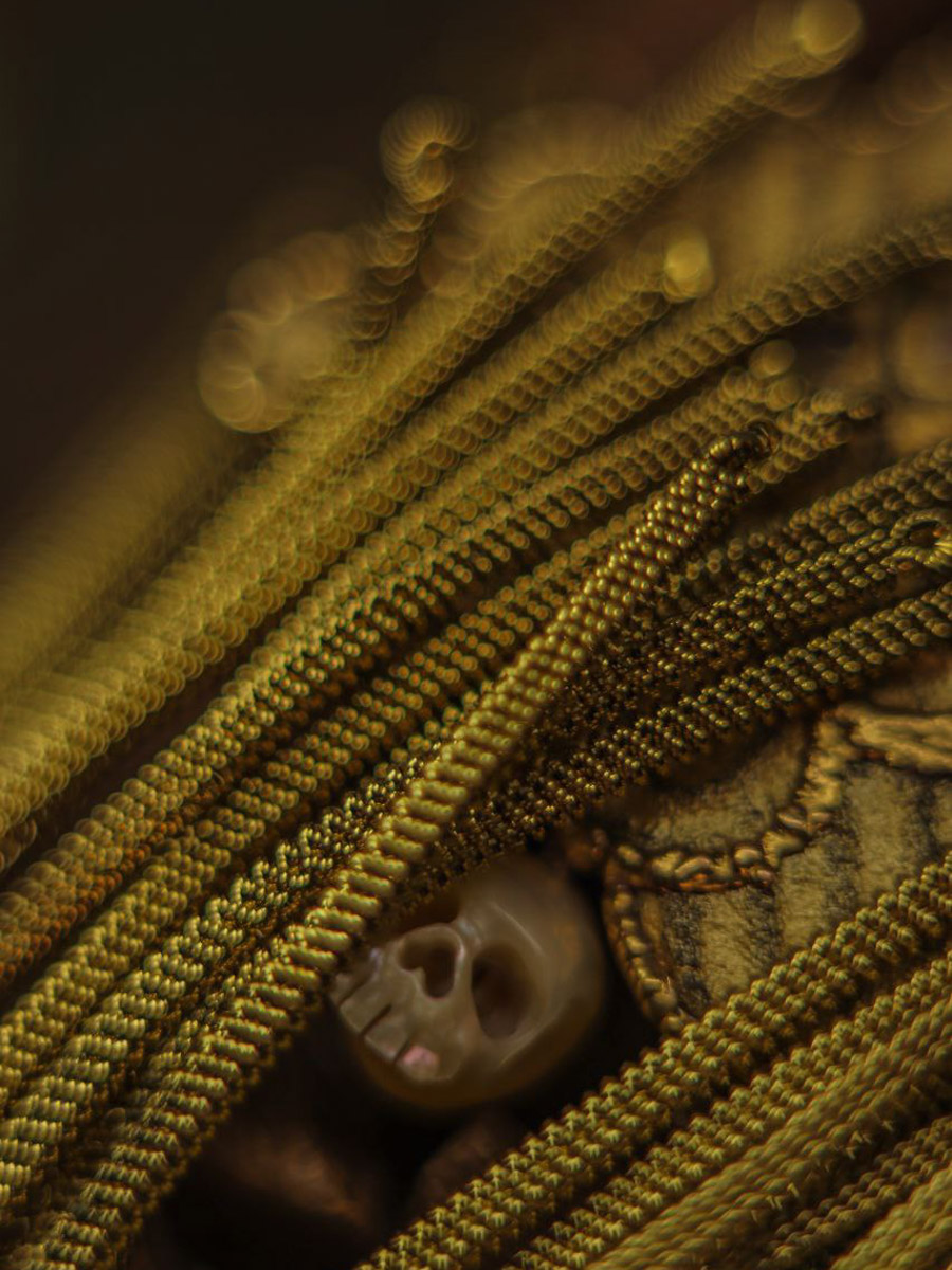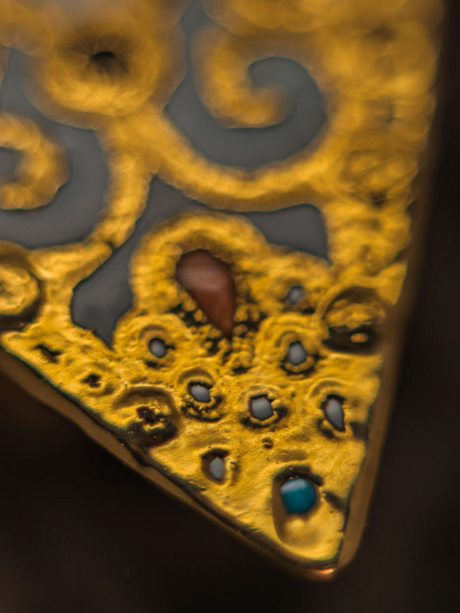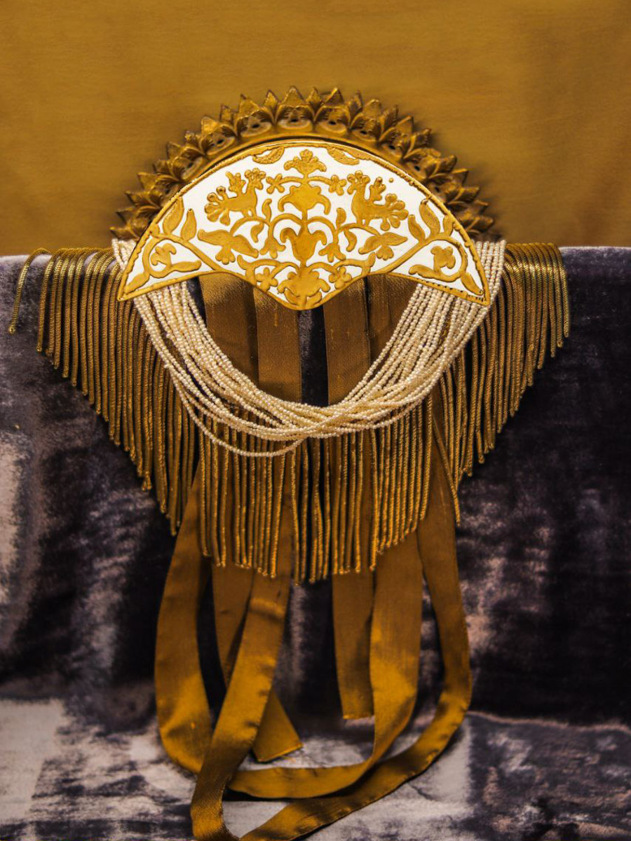«Что еще может рассказать о женской силе, если не кастет-кокошник?! В основе форма головного убора Владимирской губернии XIX века и его позатылень с золотной вышивкой с растительным орнаментом и райскими птицами. Это первые мои работы, где использовалось покрытие золотом. Теперь я в плену этой силы. Потому что хочется все вокруг покрывать этим металлом, чтобы ловить его блики в сумерках», — поделился ювелир.