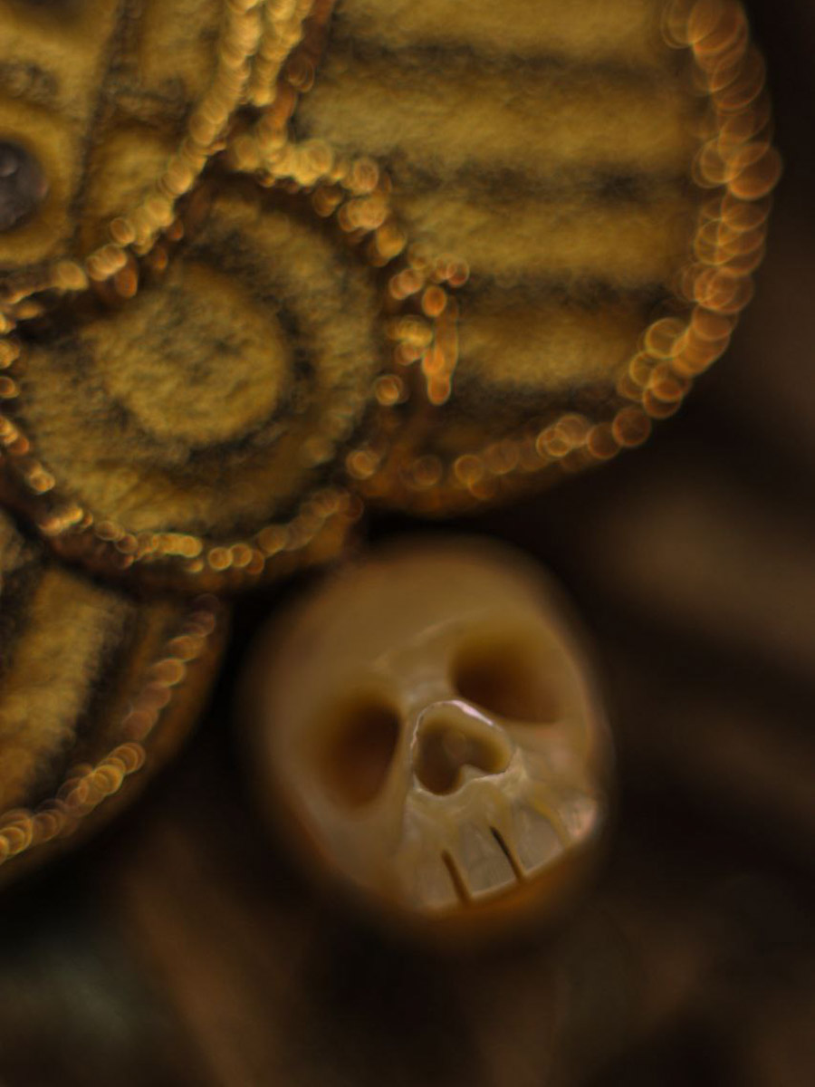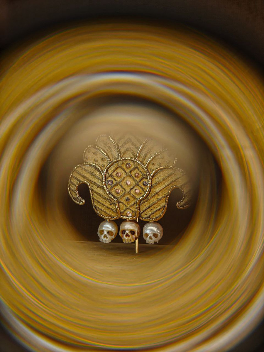 «Буду серию развивать дальше, потому что это любовь», — сообщил ювелир поклонникам своего творчества и представил серьги, которые назвал «Троедушие». Их украшают уже три жемчужины в виде черепов.