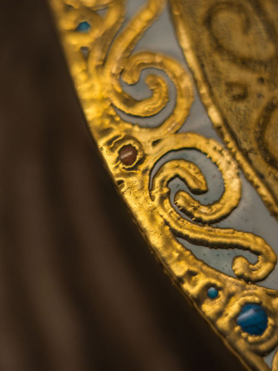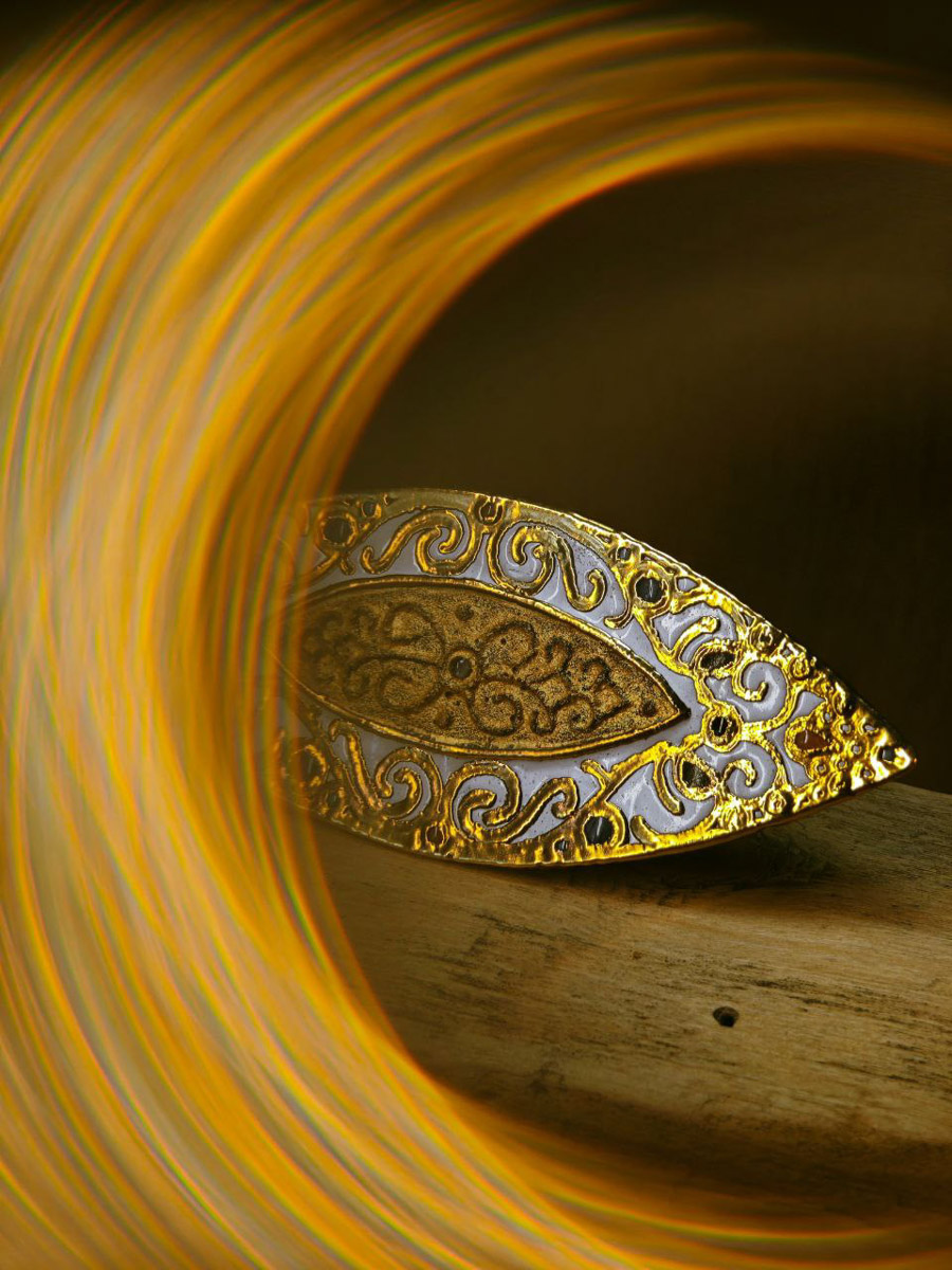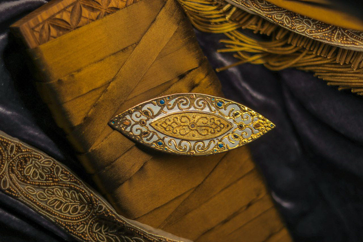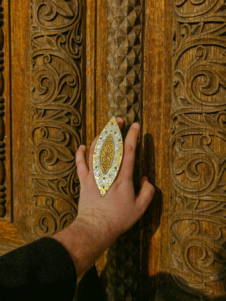 Столь же роскошно выглядит и другое крупное кольцо необычной формы. И снова Семен вдохновился женским головным убором. Чтобы достичь «нарядности», понадобилось шесть слоев эмали и обжигов в печи.