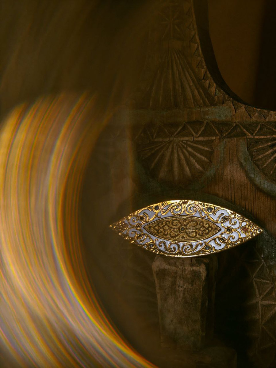 «Кольцо отсылает к золотному и жемчужному шитью головного убора XIX века Комстромской губернии. Для меня это самый органичный и выверенный женский убор из всех. Всегда долго и въедливо рассматриваю их в музеях. Подобный кокошник хранится в архивах Муромского музея и достается лишь в особых случаях. Поигрался с пропорциями и ассоциациями своего предыдущего кольца на эту тему. Новое вышло еще роскошнее и сложнее. Кстати, первое сейчас живет в США. Подтверждая, что тема переосмысления русского традиционного костюма уместна везде», — заметил автор.