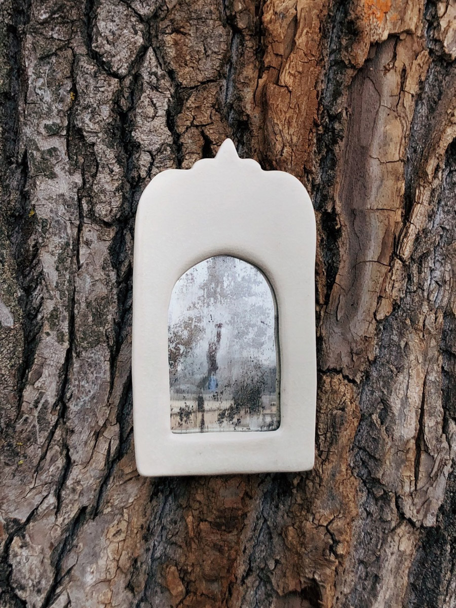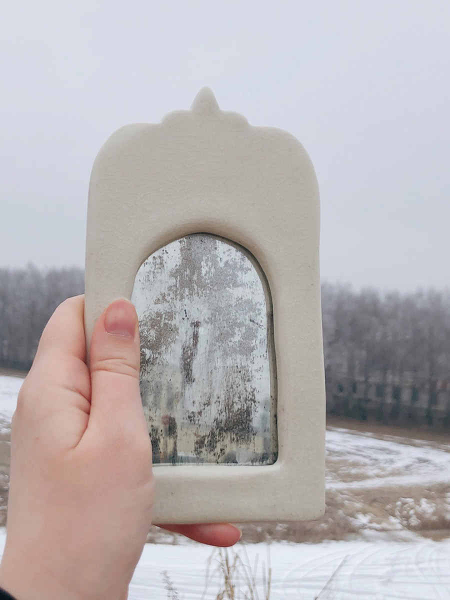 «Для динамики выставочной работы я впервые сделала „Очелья“ в разных размерах. Еще я использовала полуфарфор, чтобы нанести свою любимую глазурь — снежное кракле. Она как сад расходящихся тропок, завораживает меня. Зеркала же нужны были сложнее, многослойнее, состареннее. Важно передать ритм, сокровенность. Проходя мимо работы, вы видите только часть отражения, будто что-то еще утаилось от взора», — поделилась Елизавета в интервью известному декоратору и стилисту интерьеров Даше Соболевой.