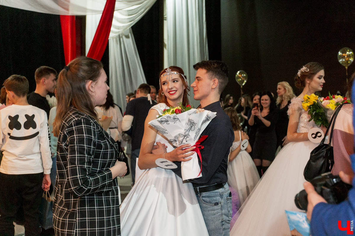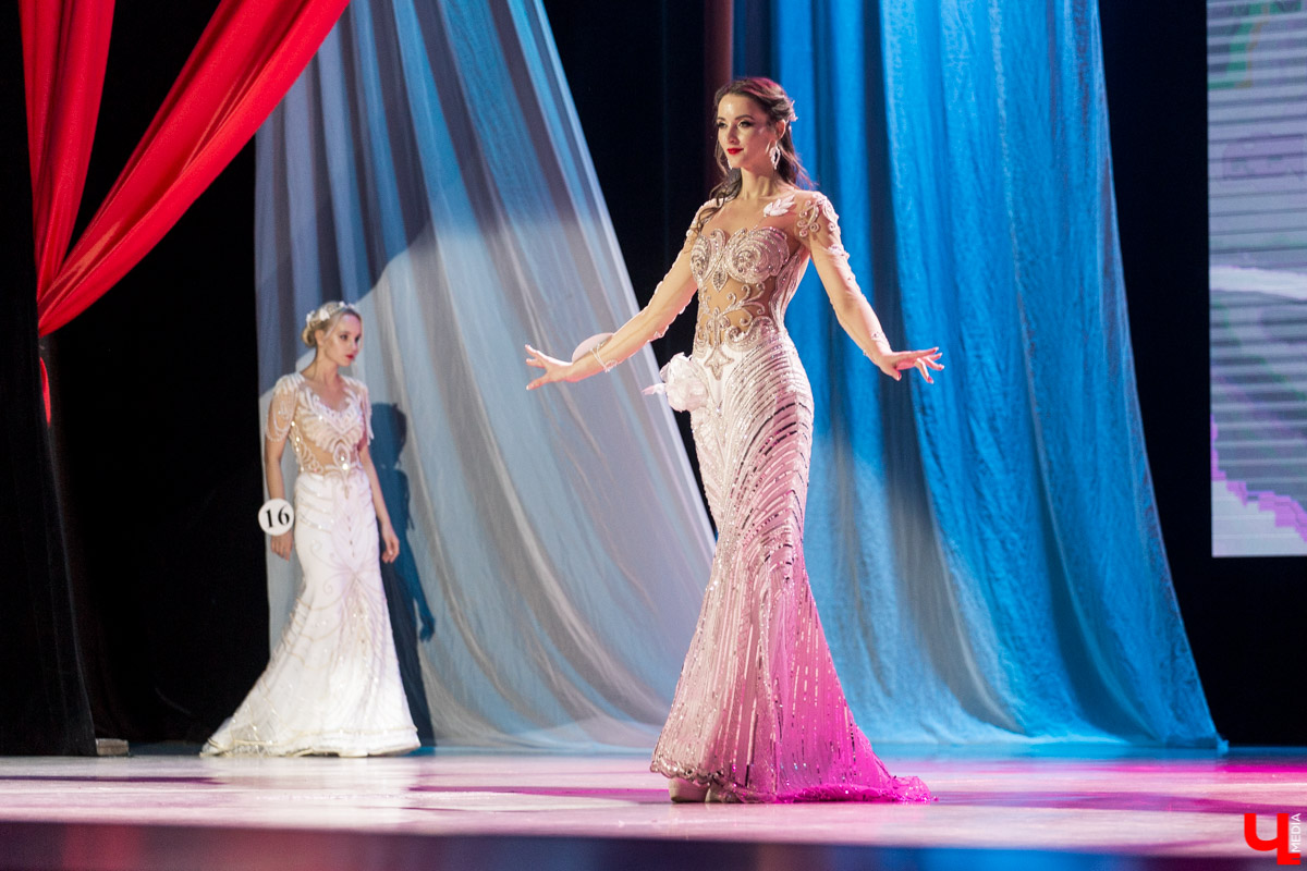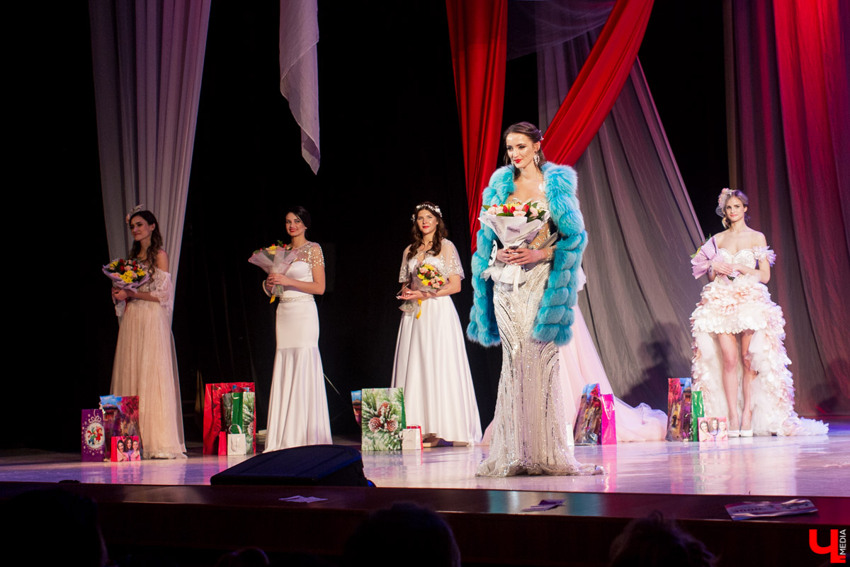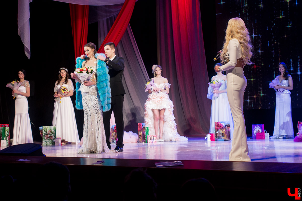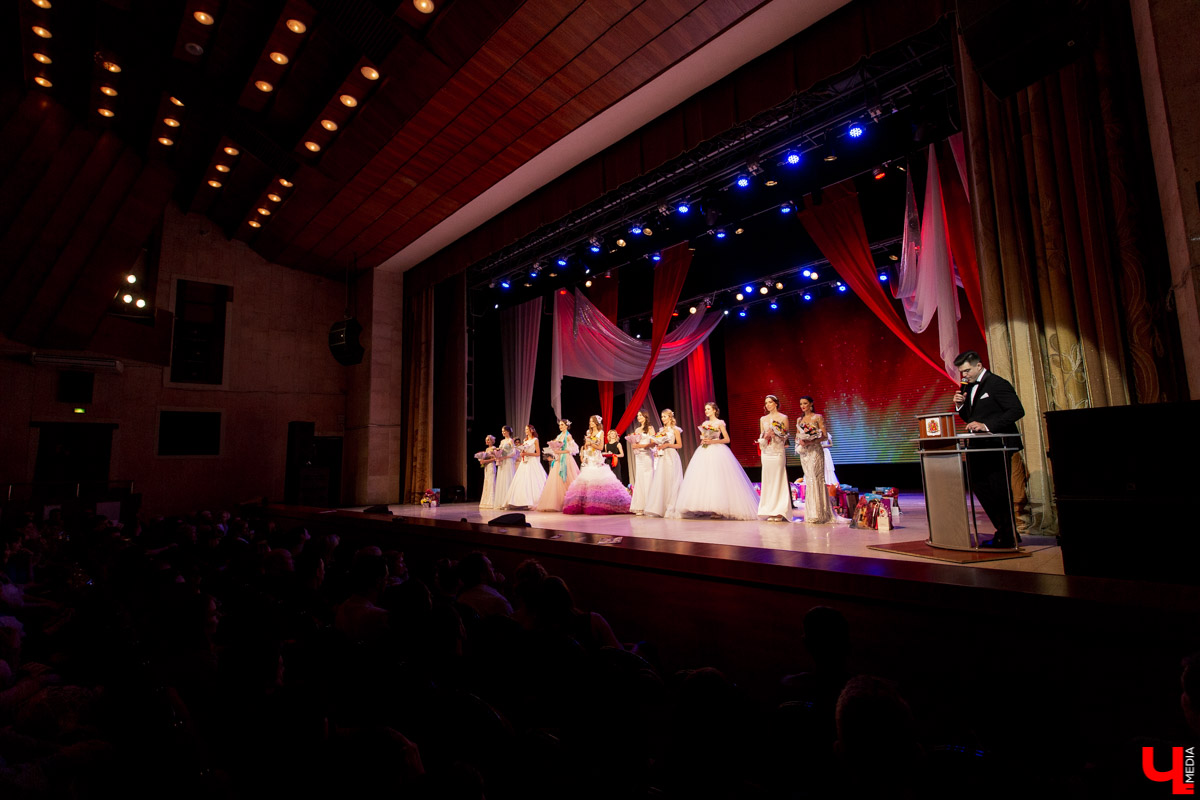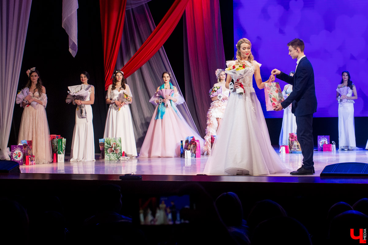 И напоследок еще один традиционный выход — в свадебных платьях. Кстати, нежнейшие эксклюзивные наряды для участниц сшила известная дизайнер Ольга Кузнецова.