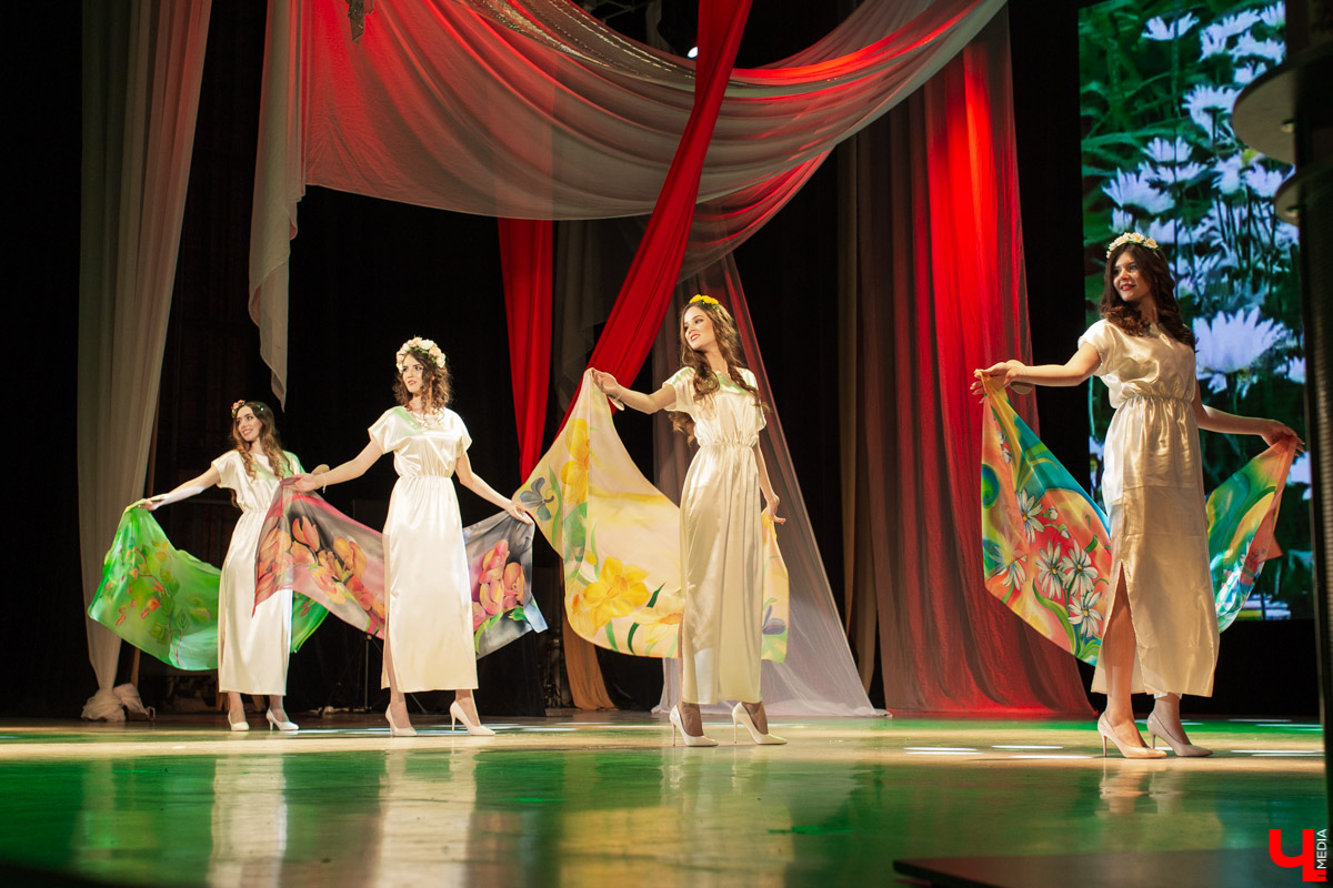 Следующая часть шоу — ноу-хау. Впервые в рамках областного конкурса провели этап «Русский образ». Очаровательные финалистки еще раз демонстрируют грацию и легкость движений в общем хореографическом номере.