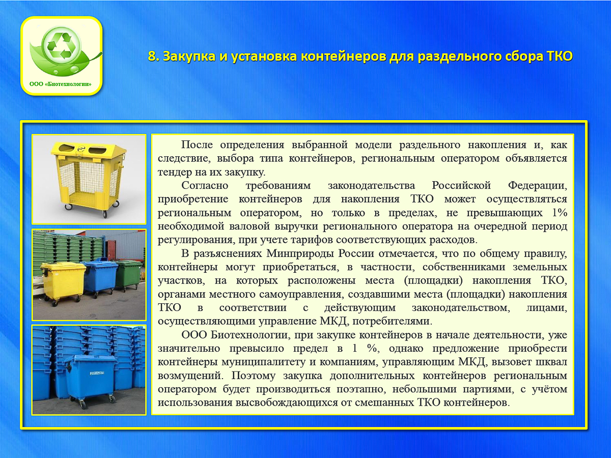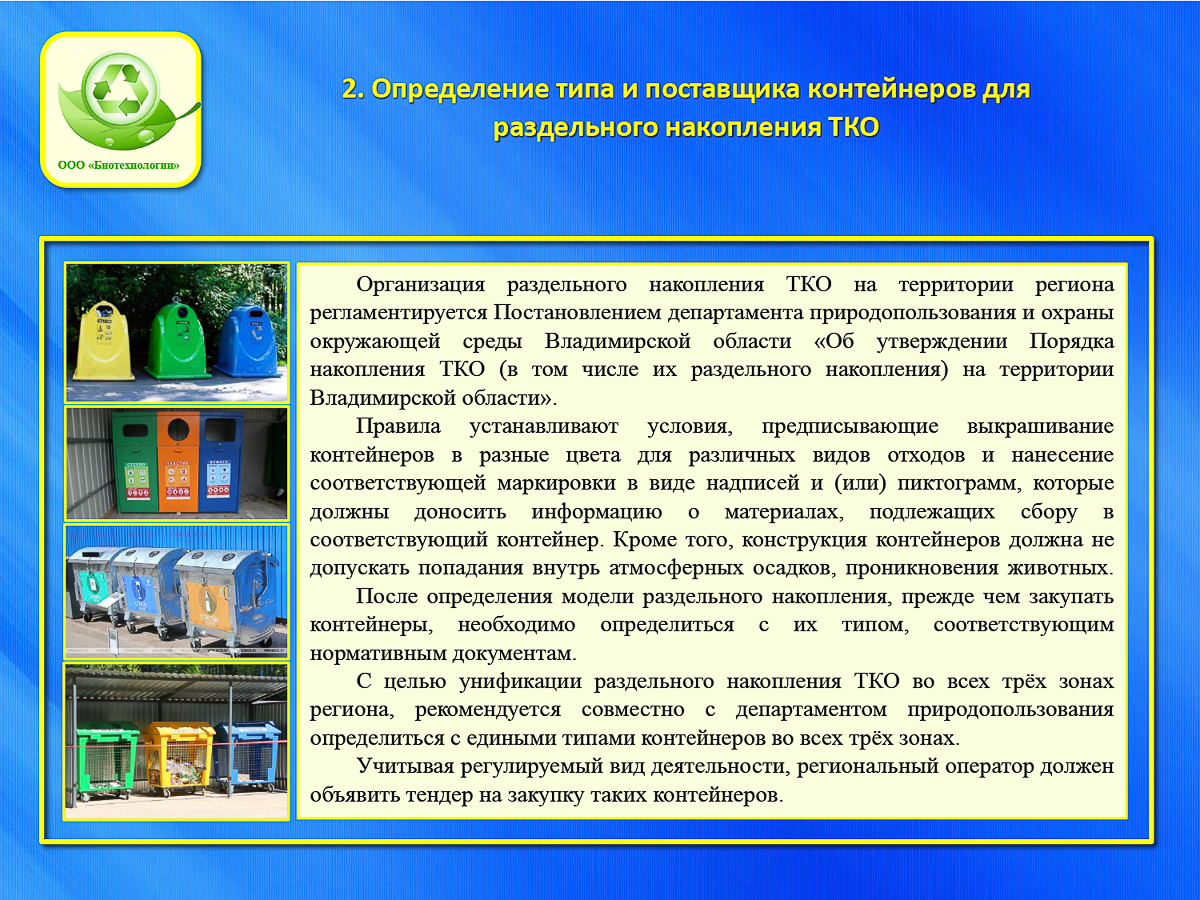 Компании «Спецтранс» и «УНР-17», сложившие свои полномочия в начале года, убрали с улиц Владимира около 4000 тысяч контейнеров, но скоро их заменят новенькие в не меньшем количестве, тара уже закуплена. Кроме этого, в «дорожной карте» обозначены задачи, которые региональный оператор должен проработать до старта сборов. Например, обеспечить (в сотрудничестве с городом, конечно) площадки для сбора ТКО, продумать логистику и оценить транспортный парк.
